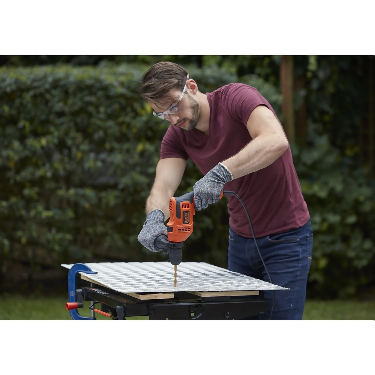 Ideal for variety of jobs around the home and garden, including hanging pictures, shelves, curtain rails or outside lights. Can be used on: masonry, brick walls, wood, metal, plastic and tiles. This hammer drill is perfect balance of performance and a lightweight compact design. The corded 500W motor provides a constant supply of power to tackle medium duty drilling to get tough tasks completed quickly. The variable speed delivers controlled and accurate results. The adjustable side handle gives you the ability to feel safe and comfortable whilst completing your tasks. The 13mm keyless chuck with spindle lock enables you to change drill bits tool free for secure grip of the bit. The BLACK+DECKER 13mm 500W Corded Hammer Drill is a great starter kit for any DIYer who would like to start to tackle medium duty drilling tasks around the home. Comes with a side handle.
