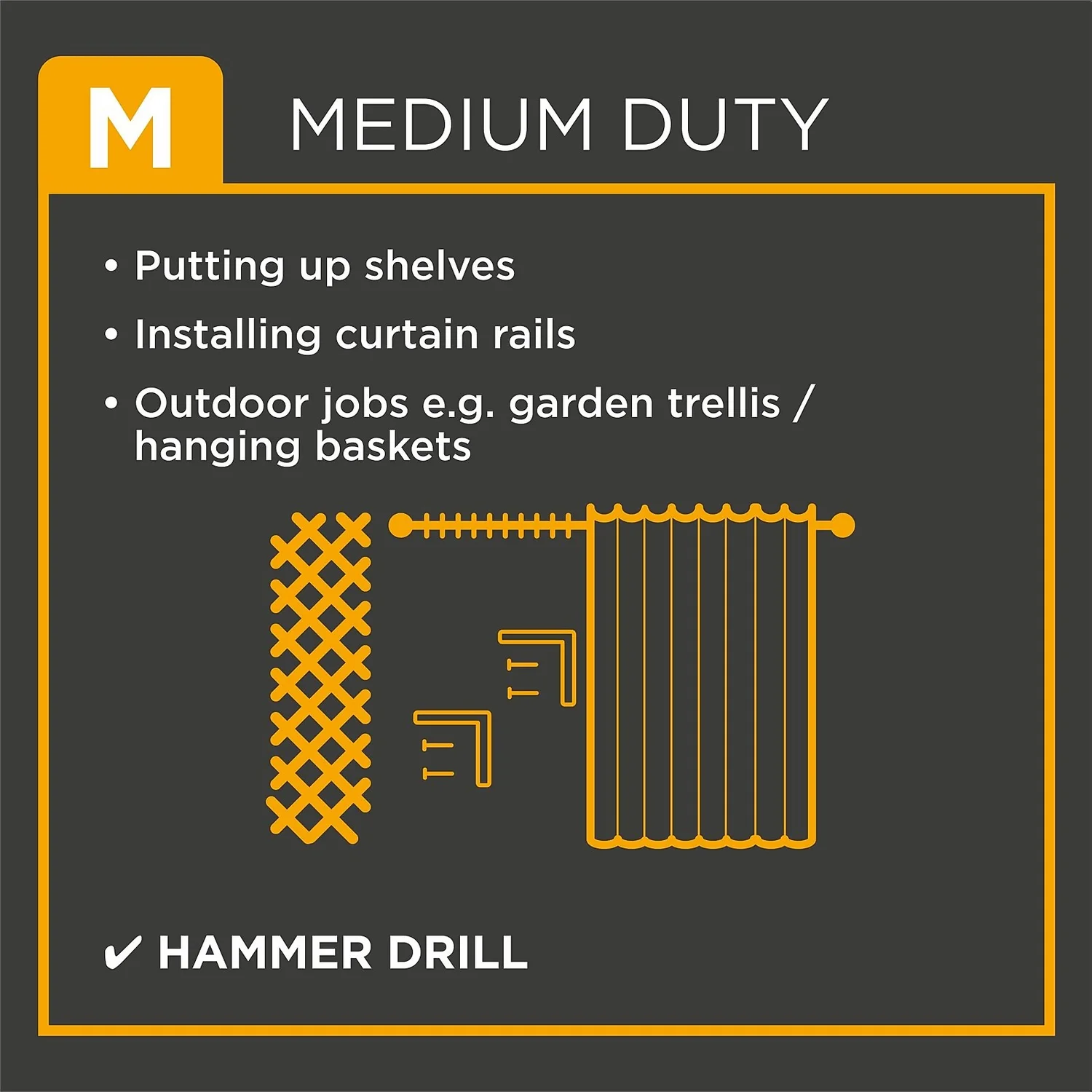 - Hammer action suitable for heavy duty drilling into masonry and brick work