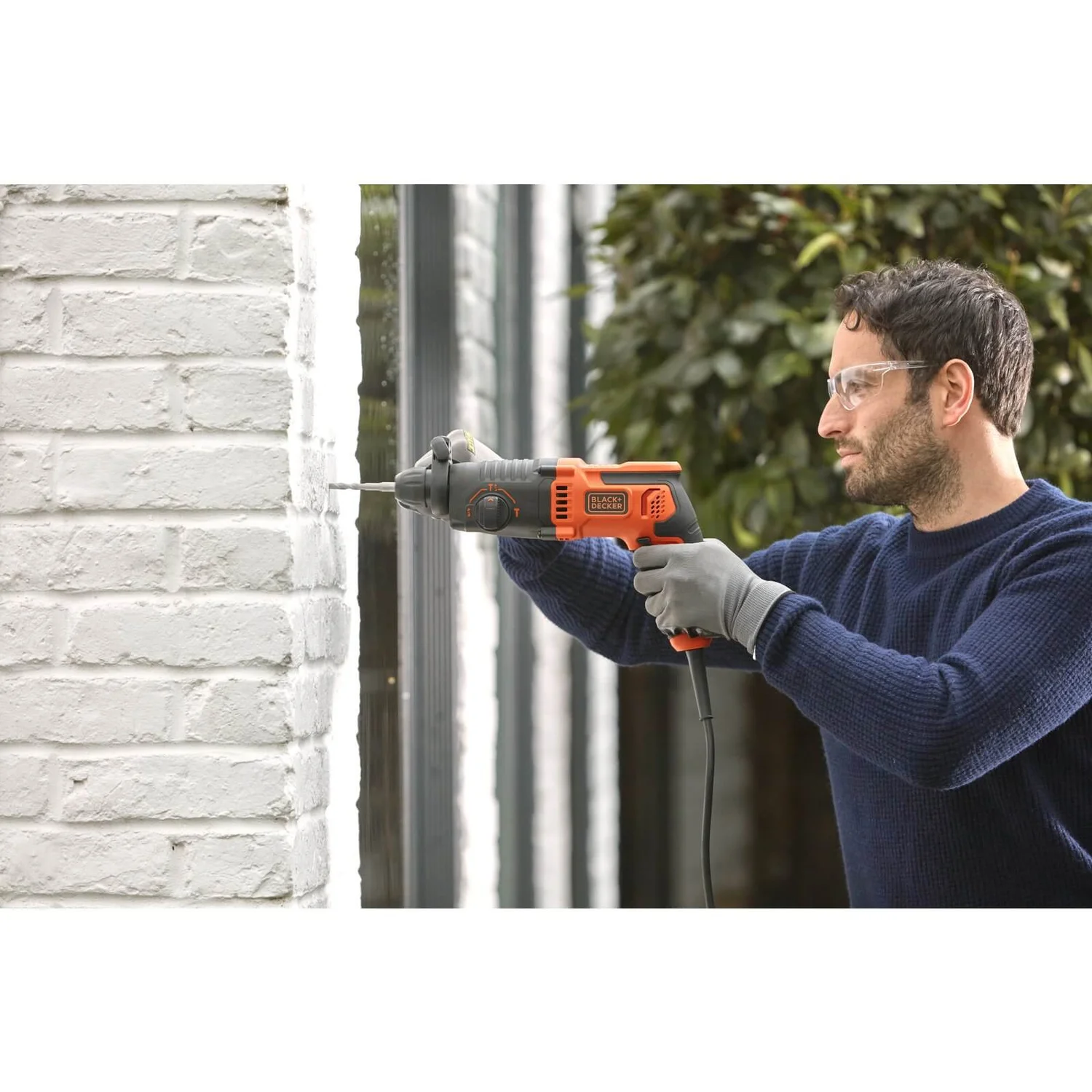 Ideal for a variety of jobs around the home and garden, including hanging pictures, shelves, curtain rails or outside lights. Also suitable for chiselling and chipping of small areas of brick, soft masonry, concrete, wall and floor tiles. Can be used on: masonry, concrete, brick walls, wood, metal, plastic and tiles. The Corded SDS Plus Drill has been designed for repetitive medium-duty drilling, chiselling and chipping tasks to be effortlessly completed. The SDS chuck accepts more SDS drill bits specifically designed for tougher applications. You can quickly change between the three drilling and hammer modes to suit the task at hand. The 1.4J motor delivers high impact energy making it easier to complete tasks including light chiselling/chipping applications into brick, soft masonry and occasionally concrete. The BLACK+DECKER 650W Corded SDS Plus Hammer Drill has been designed to be a heavy-duty edition to an intermediate to advanced user’s toolbox. Comes with keyed chuck, 8mm SDS-PLUS Bit, 6mm SDS-PLUS Bit.