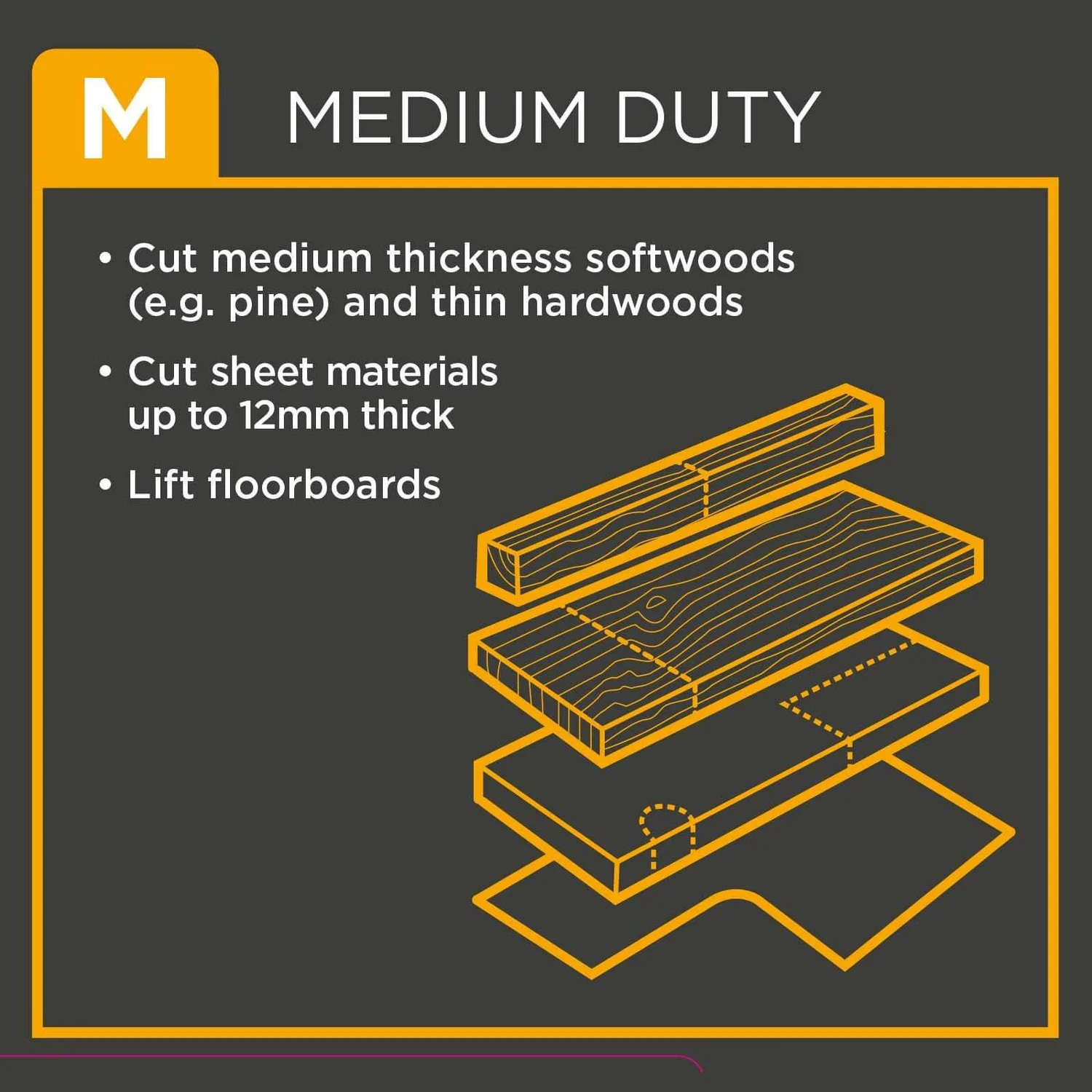 Ideal for cutting materials such as MDF, Plywood, OSB, chipboard, laminate, softwood, metal, skirting boards, decking, plastic pipes, tree branches and general garden trimming. Can be used on wood, metal and plastic (depending on blade used).