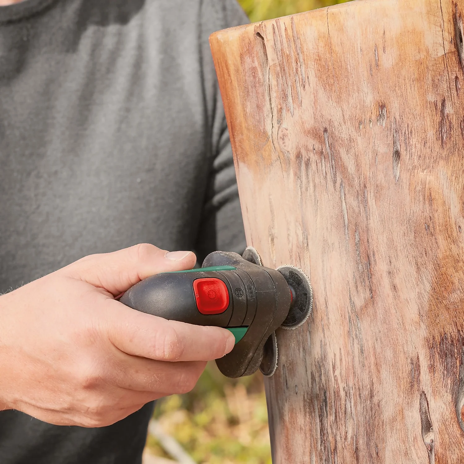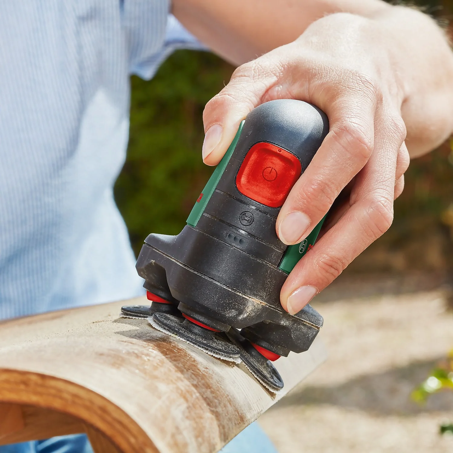 Introducing EasyCurvSander 12, the very first cordless disc sander and polisher. Discover smooth working with three rotating, movable discs for sanding and polishing of flat, curved and rounded surfaces. Its long-lasting sanding nets provide high material removal rates and excellent surface quality across a range of applications. Match the operating speed to each material and job thanks to electronic speed preselection. Enjoy low vibration and low noise during operation. A dust extraction attachment helps to keep the working area cleaner. For sanding and polishing hardwood, softwood, varnished surfaces, metal, and leather.