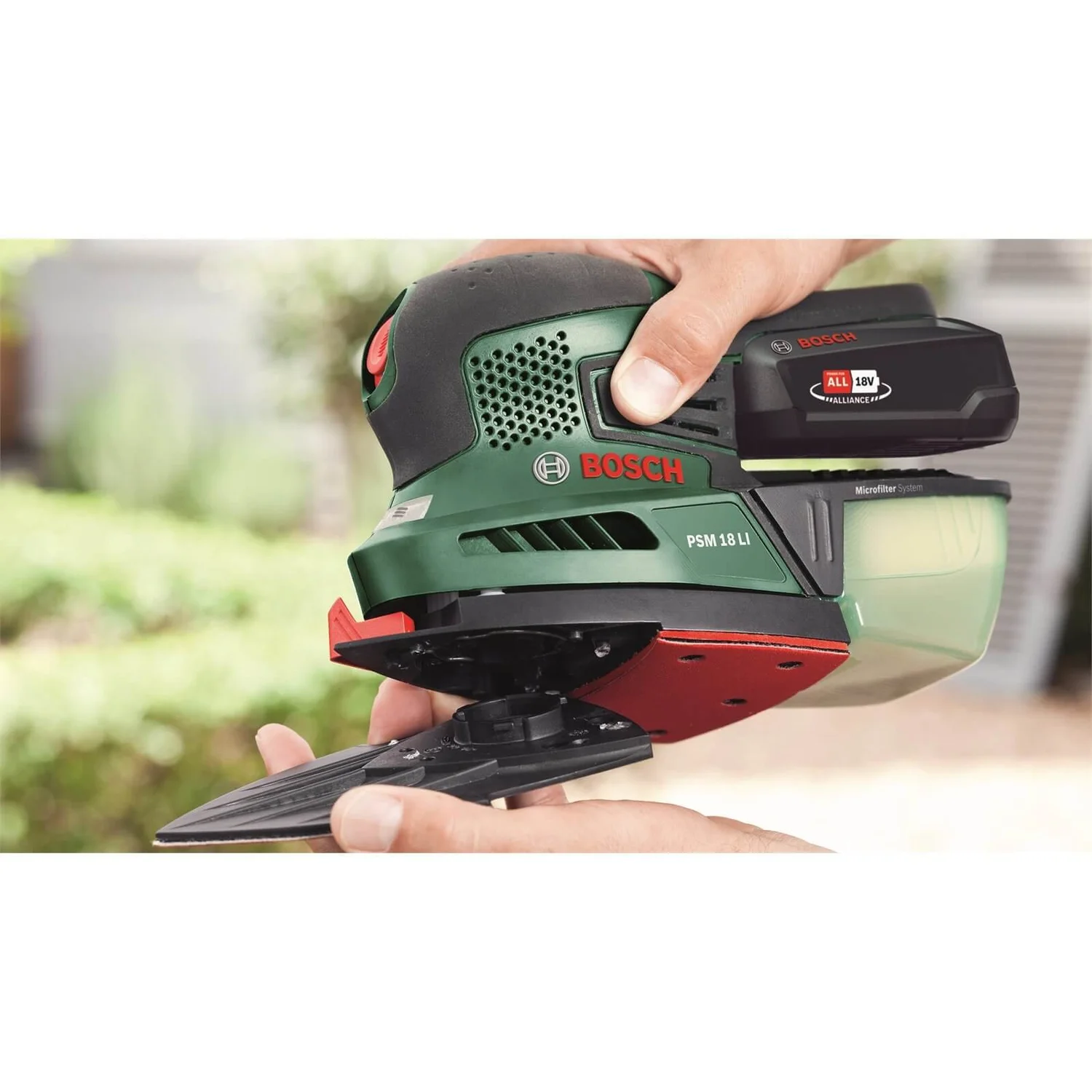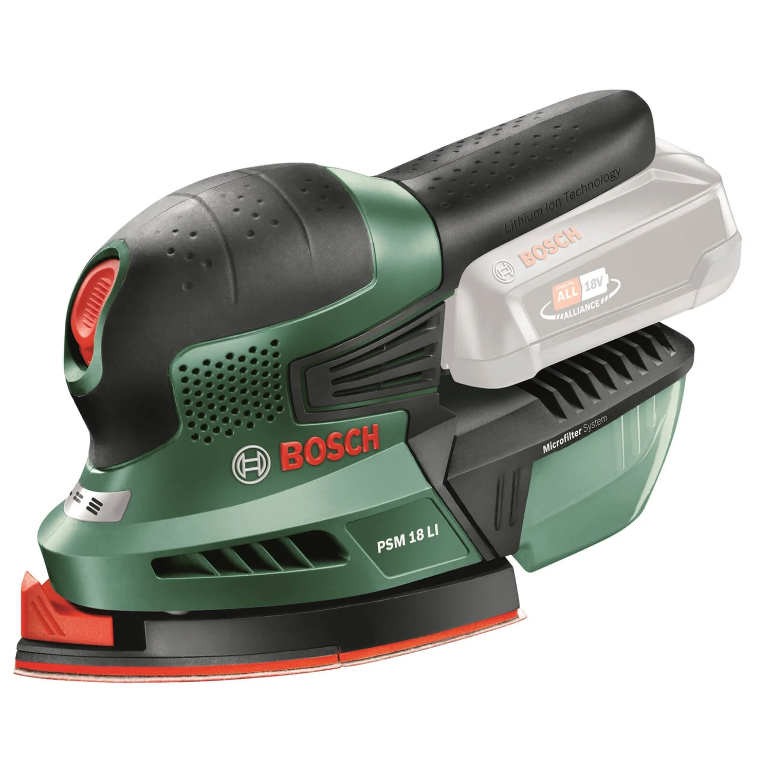 The PSM 18 LI is really versatile and has been designed for a variety of sanding projects, including working in corners, on edges, and on medium-sized flat surfaces. Enjoy quick sanding attachment changes thanks to the SDS system. The triangular tip is rotatable to ensure optimal sanding paper use. Sanding paper changes are quick and easy due to the hook-and-loop fastening system. This multi-sander can be used on hardwood, softwood, varnished and painted surfaces, metal, and stone to complete projects on furniture, doors, frames, and stairs. The Microfilter System box reduces dust.