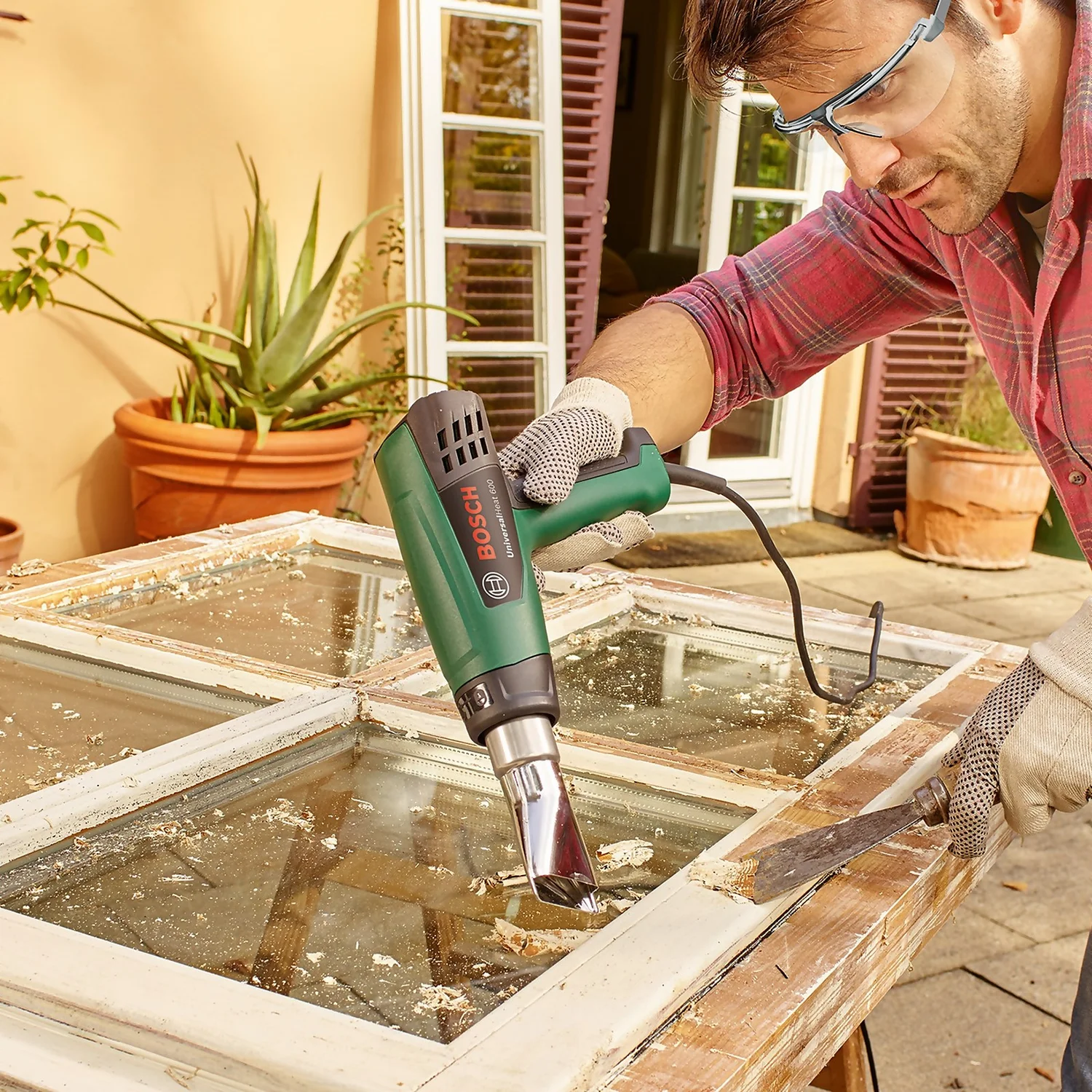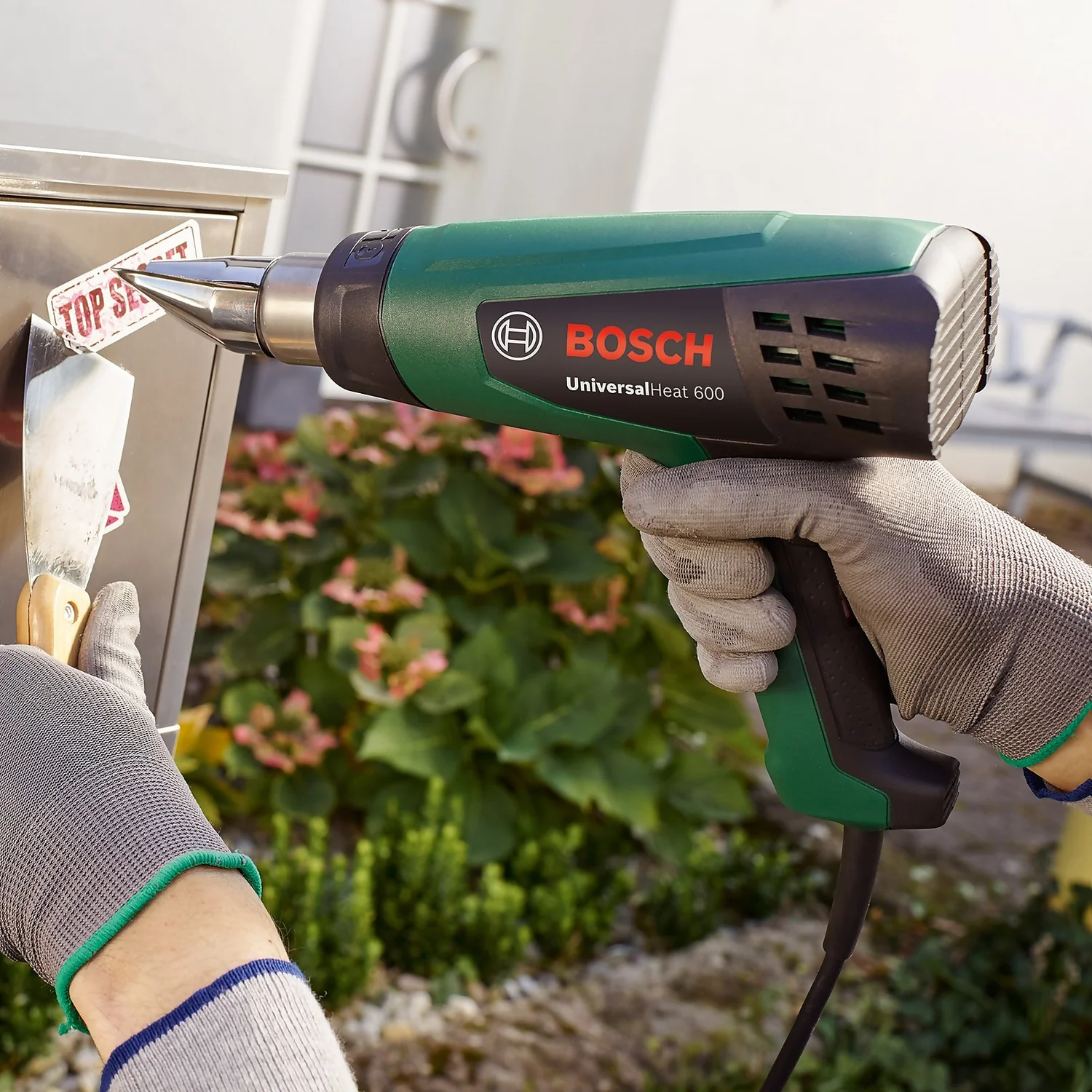 This heat gun has the versatility needed for many applications. The removable heat shield allows for adaptability for work in narrow spaces. The UniversalHeat 600 heating element provides a fast heat-up time and even heat distribution for excellent performance. Additionally, the three-step on-off switch offers different temperature and airflow options. The heat gun can tackle many tasks with a variety of nozzles, such as removing paint, thawing water pipes, killing weeds, drying filler, shrinking cables and for creative projects.