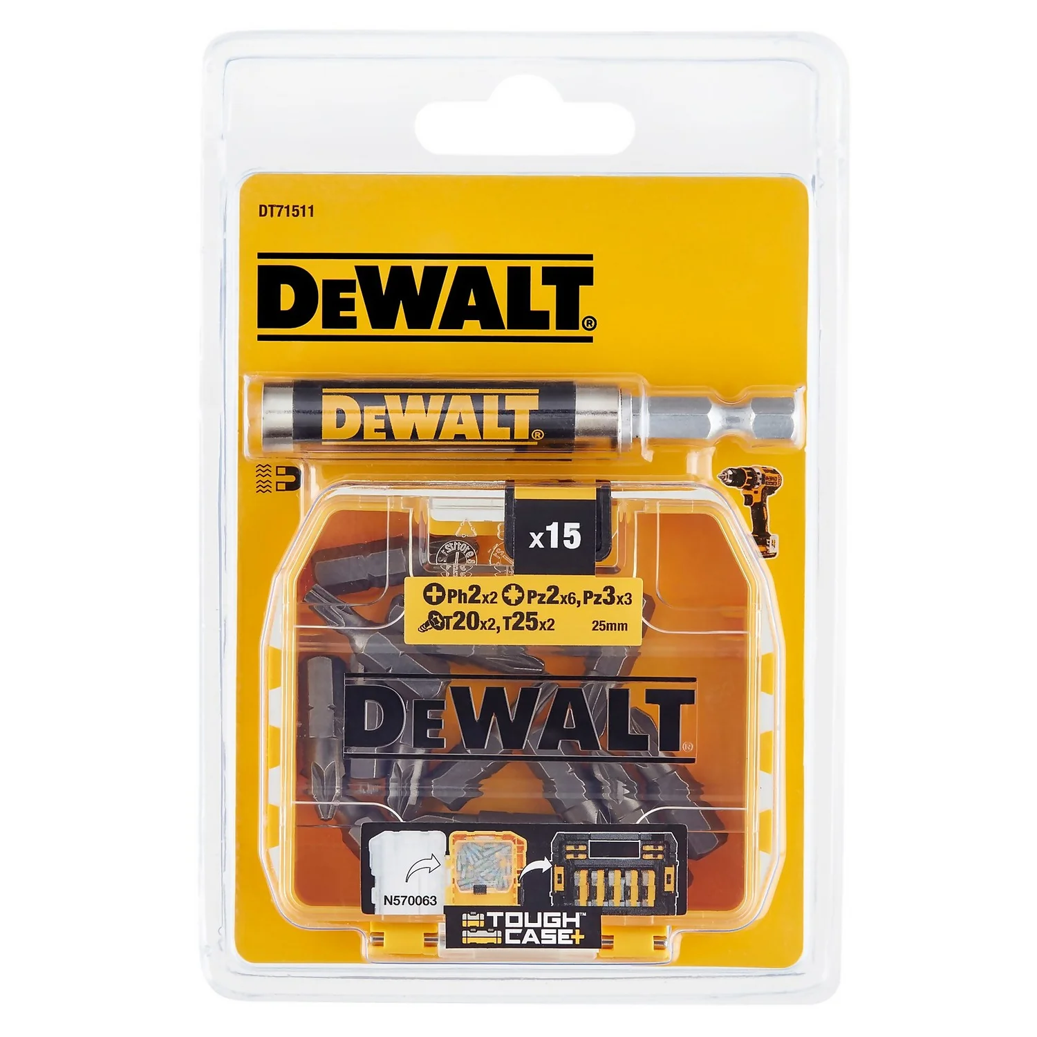 The DEWALT DT71511 16-piece set is a small compact, portable and durable screw bit set box for the safe storage of your screw bits. Featuring a magnetic screw bit holder for easy connection of the bits and the clear lid for easy bit identification. The storage case has a modular design so will fit easily into most tool boxes.