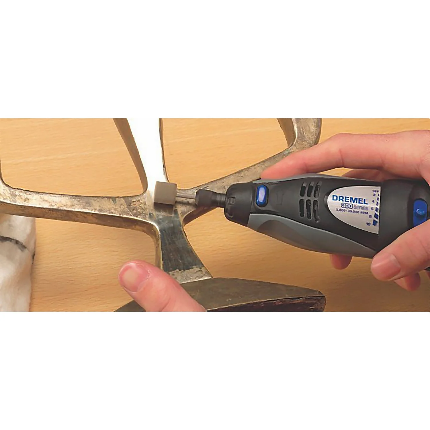 The Dremel 520 Impregnated Polishing Wheel comes with pre-applied polishing compound and is best for light stock removal on metals