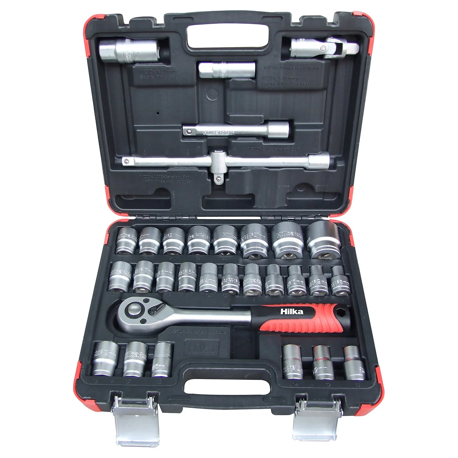 Contents 18 x 6 point pro drive sockets 8, 9, 10, 11, 12, 13, 14, 15, 16, 17, 18, 19, 20, 22, 24, 27, 30, 32mm. 6 x 12 point pro drives sockets 10, 12, 14, 15, 17, 19mm. Ratchet handle 5″ & 10″, extension 3/8″ x 1/2″ adaptor. Extension bar and adaptor can be used as a sliding T bar 16 & 21mm plug sockets and universal joint.
