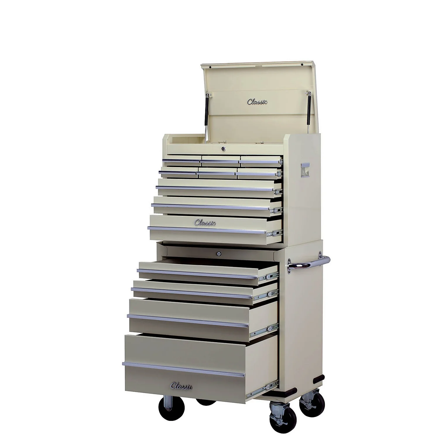 Classic 26″ combination unit design to suit classic car owners and car enthusiasts with gas struts, lift latch, 5″ locking castors and lockable ball bearing drawer slides for a smooth secure operation.