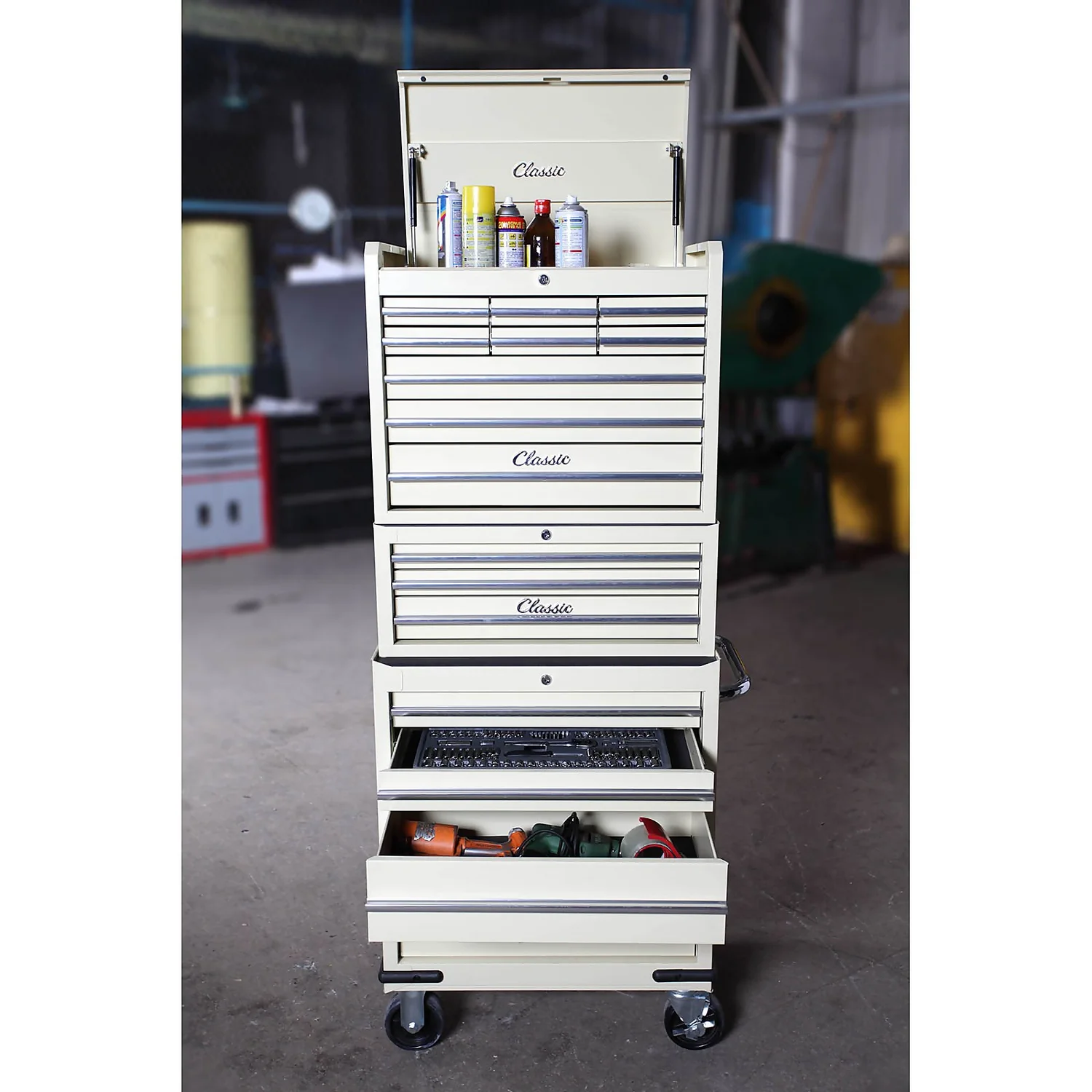 - Classic 26″ combination unit design to suit classic car owners and car enthusiasts with gas struts, lift latch, 5″ locking castors and lockable ball bearing drawer slides for a smooth secure operation