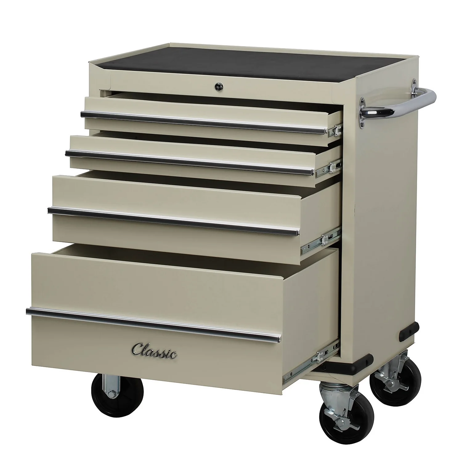 Classic 26″ tool trolley design to suit classic car owners and car enthusiasts with 5″ locking castors and lockable ball bearing drawer slides for a smooth secure operation. Large design suitable for holding a large number of tools with 2mm drawer liners and 10mm top mat. Chrome plated tube side handle and full length aluminium drawer pulls with positive stop. Tool trolley compatible with Classic tool chest for a total storage solution. Overall size: width 676 x depth 461 x height 879mm, two small drawers 609 x 407 x 76mm, one medium drawers 609 x 407 x 152mm and one large drawers 609 x 407 x 257mm. Weight 38.9kg with total capacity of 130kg.