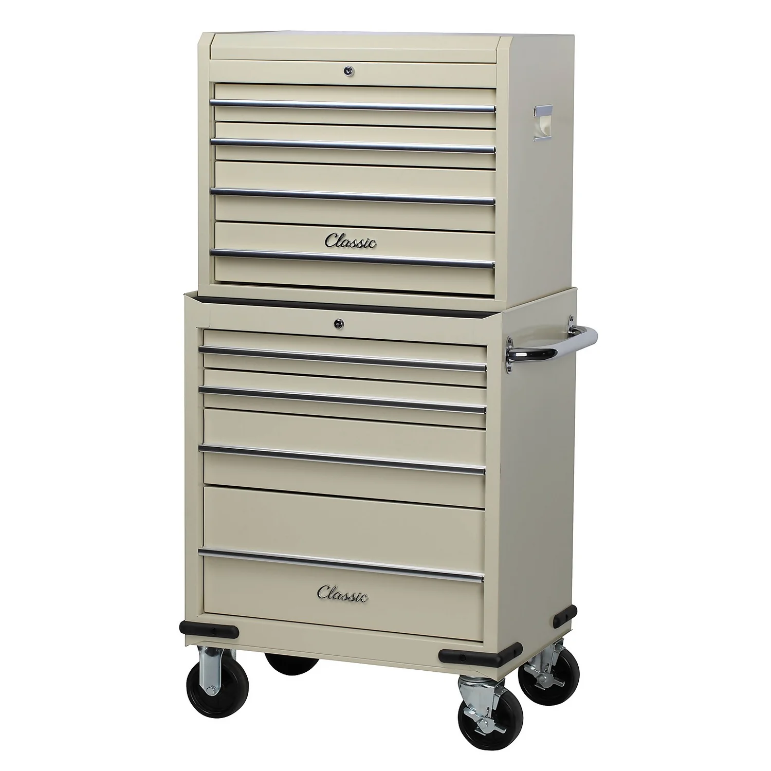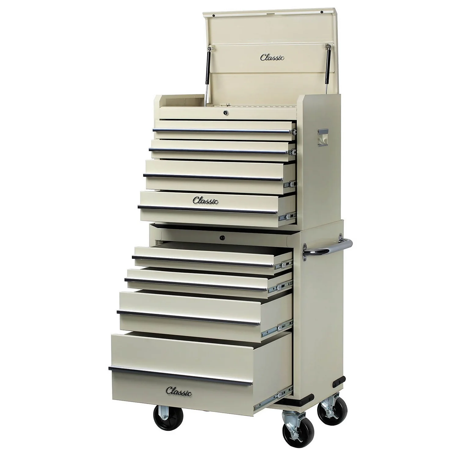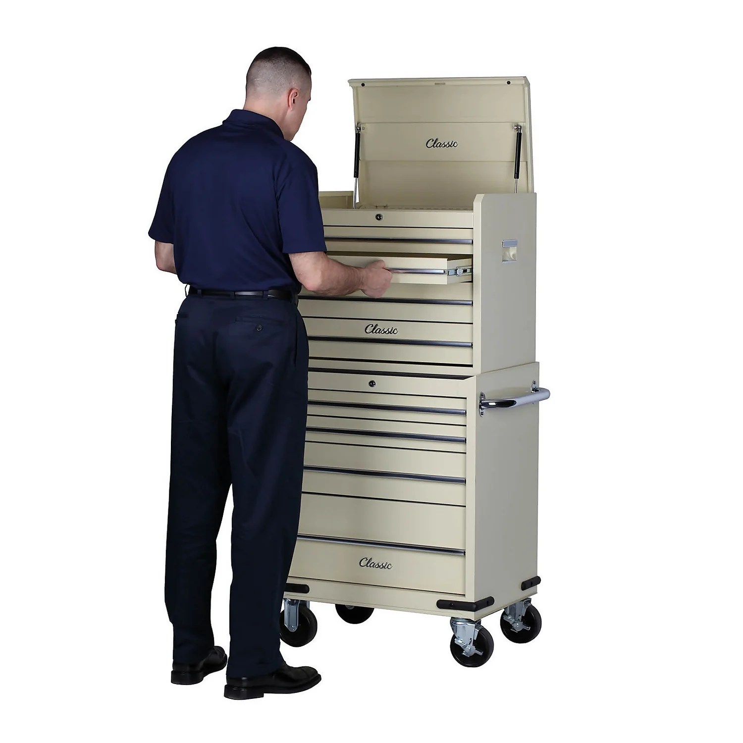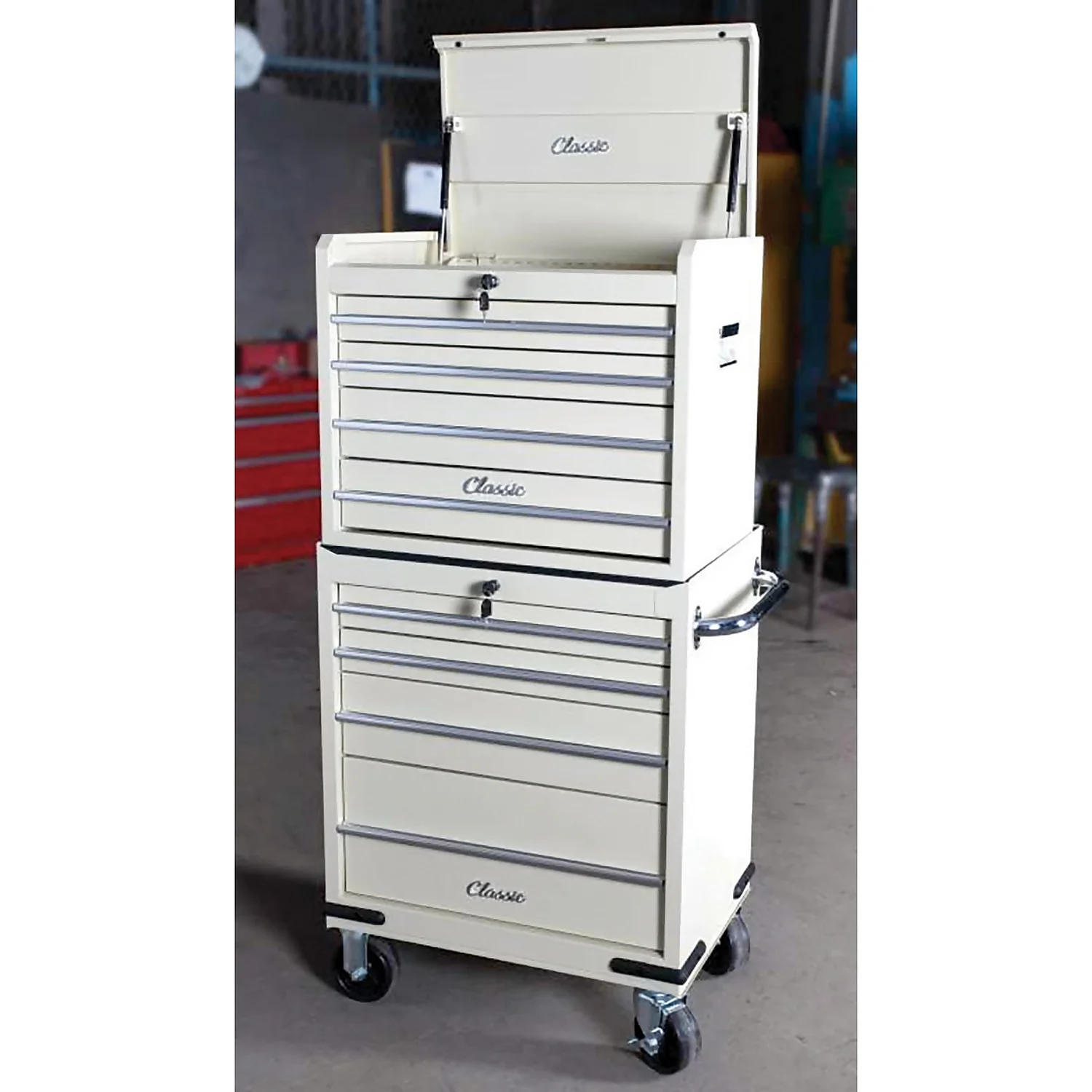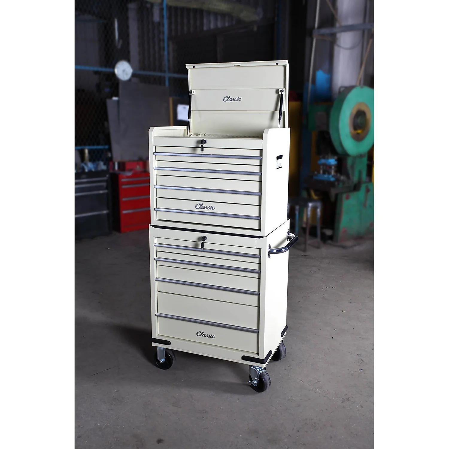 - Classic 26″ combination unit design to suit classic car owners and car enthusiasts with gas struts, lift latch, 5″ locking castors and lockable ball bearing drawer slides for a smooth secure operation