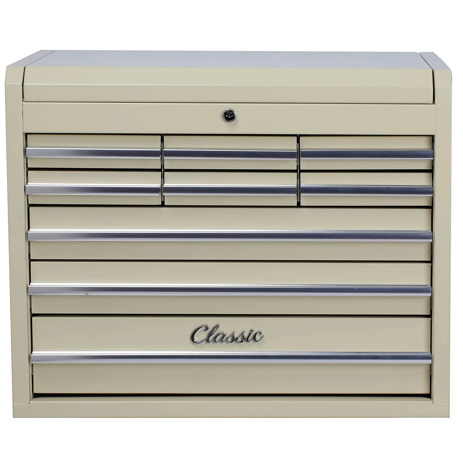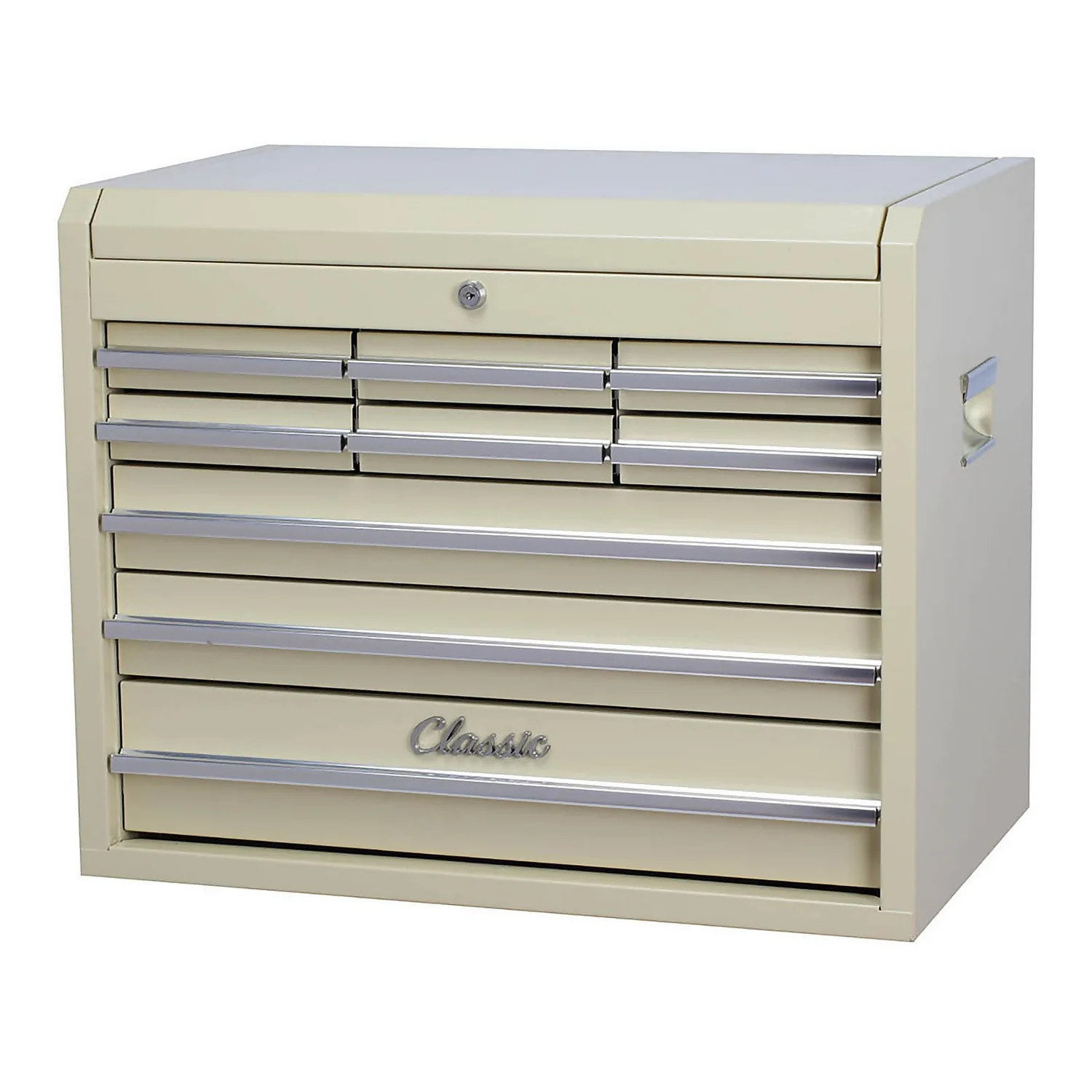 Featuring chrome plated side handles and full length aluminium drawer pulls with positive stop. Top tool chest compatible with Classic tool trolley for a total storage solution.