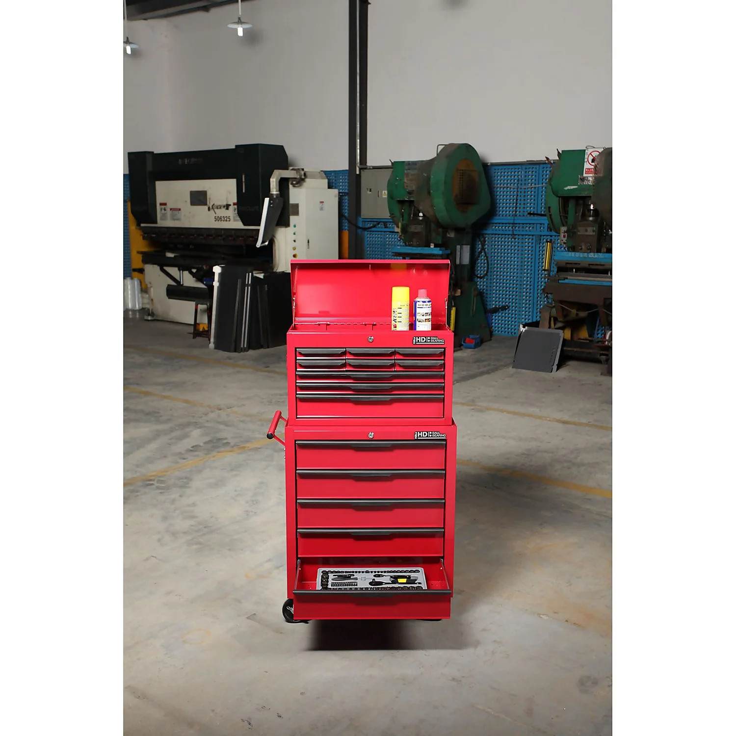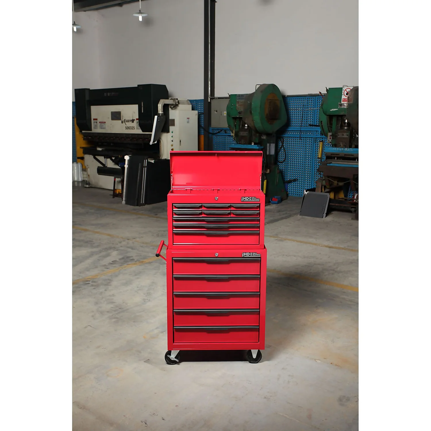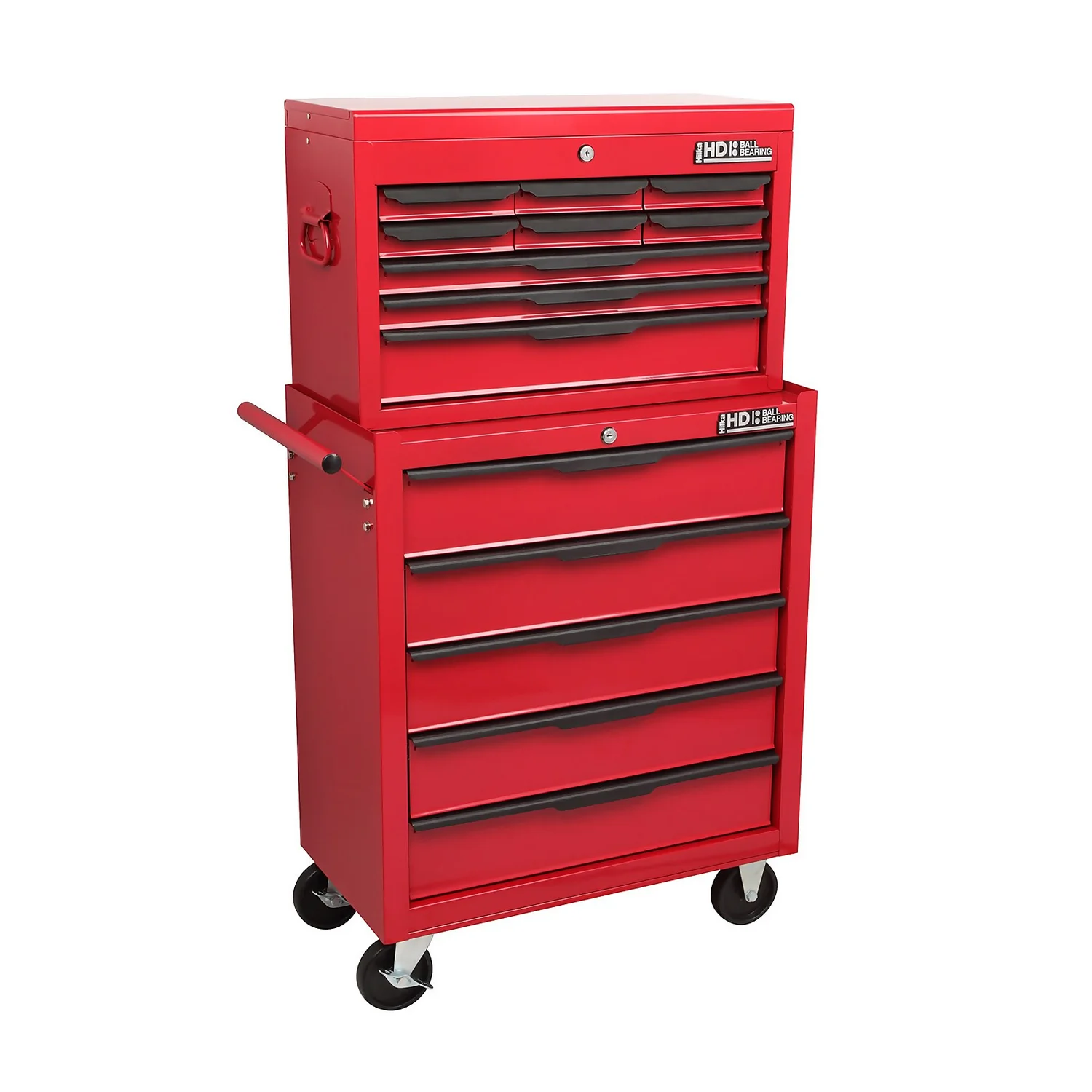 All steel construction with ball bearing slide. Key locking facility with full length drawer pulls and durable paint finish. Consists of a 9 drawer chest and 5 drawer trolley. Pro-craft branded with colour labels for retail display. Dimensions with lid closed, excluding side handle: width 615x depth 330 x height 1130mm.