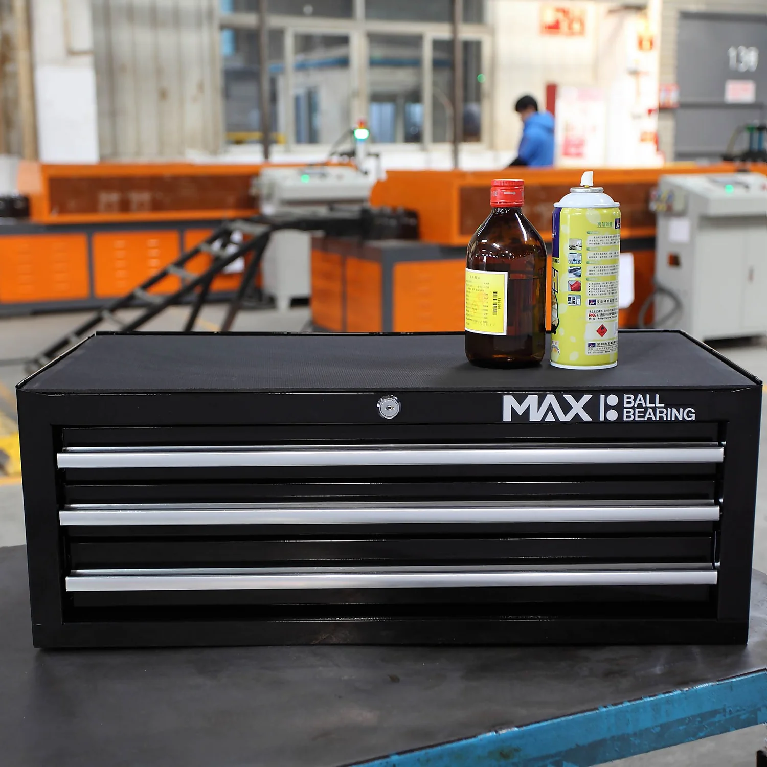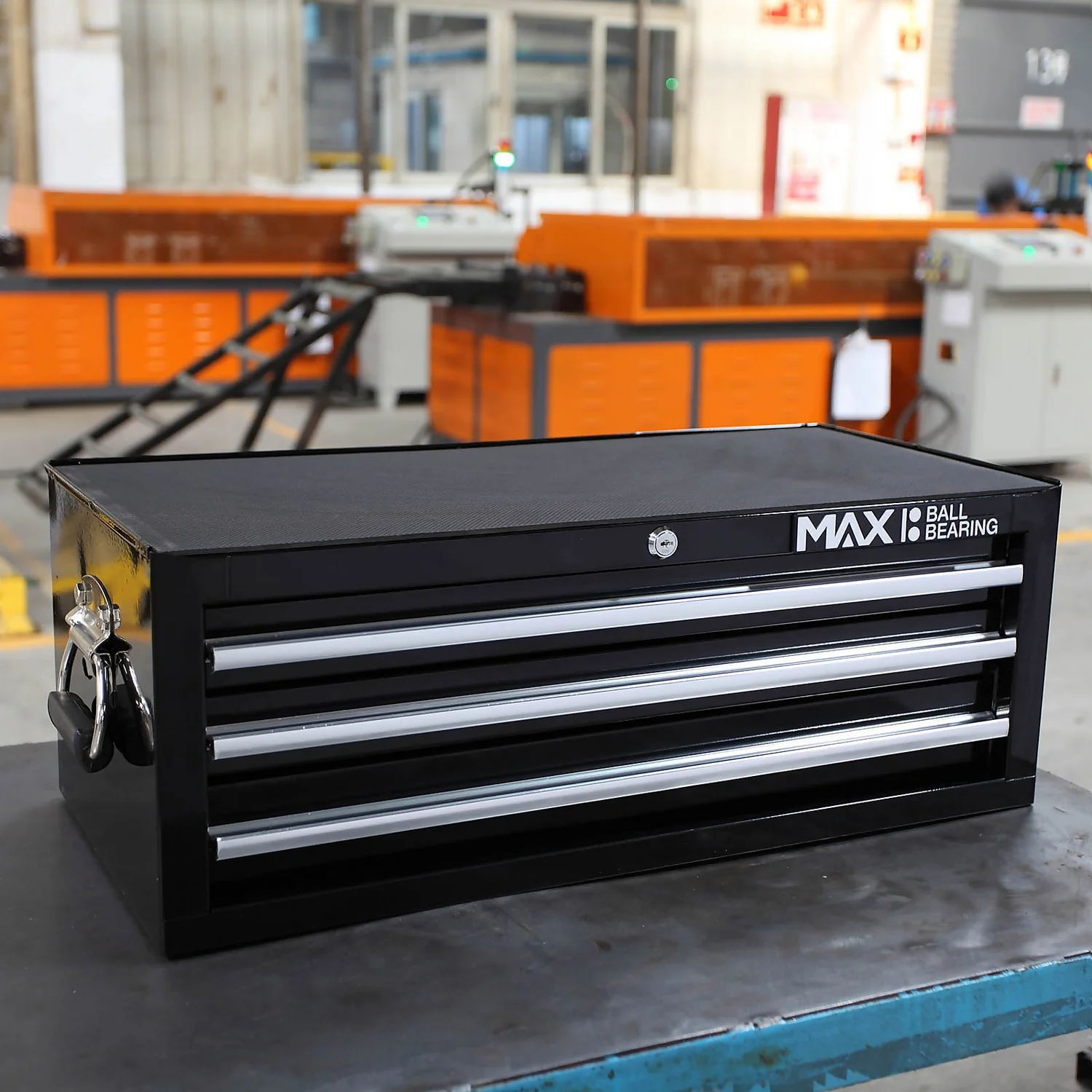 Heavy duty all steel construction with ball bearing slides and positive stop. Reinforced base comes with protective drawer liners, keyed locking mechanism, full length aluminium drawer pulls and chrome side handles.