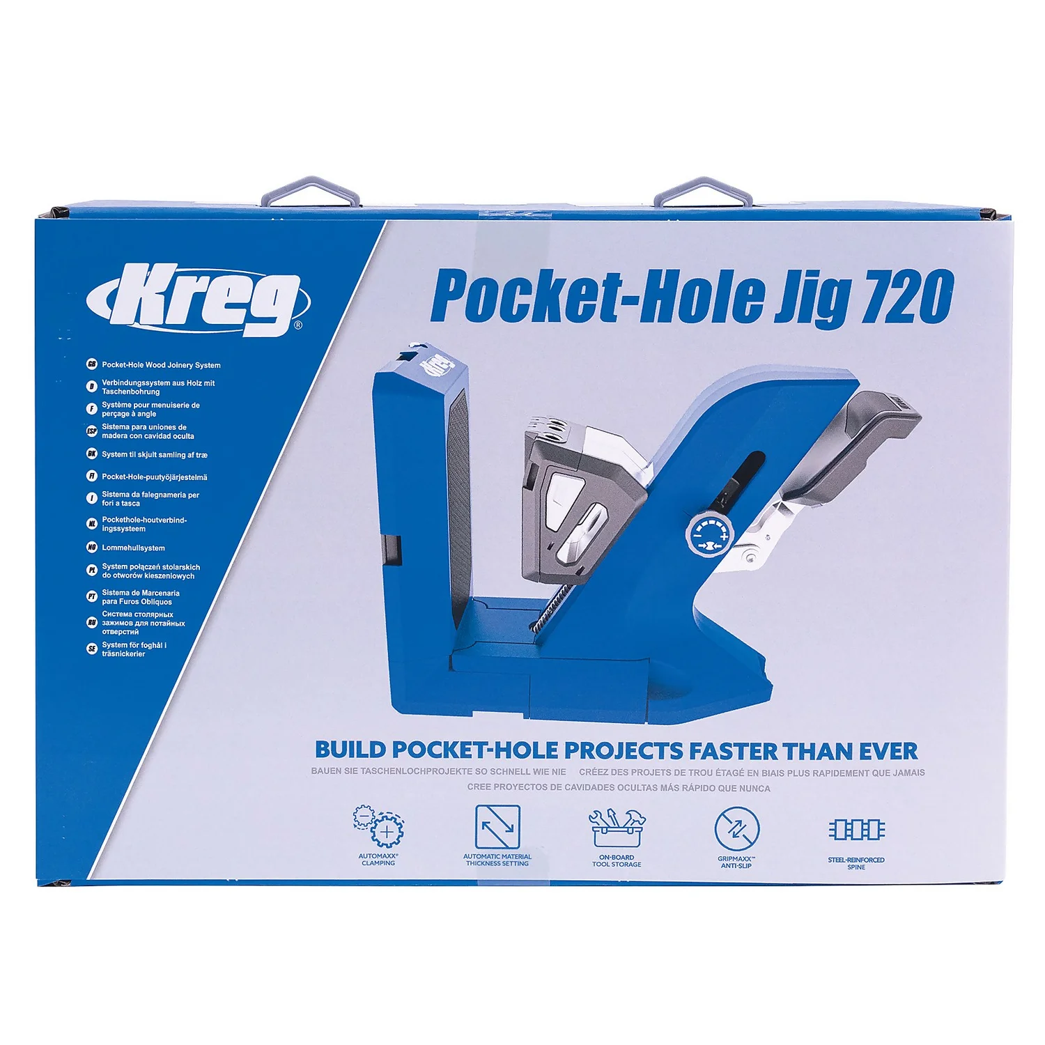 Build pocket-hole projects faster than ever. The Pocket-Hole Jig 720 is the most advanced jig yet from Kreg with features that make project building incredibly efficient. One-motion clamping with Automaxx clamps your material in place, and it automatically adjusts to the exact thickness of your material from 13-38mm (1/2″-1-1/2″). GripMaxx anti-slip holds the project piece securely so you never have to worry about shifting while you drill pocket holes. This sturdy jig also features a steel-reinforced spine for years of use. The on-board tool storage keeps accessories like the hex wrench and drill bits close at hand. With the Pocket-Hole Jig 720, you get 60 Kreg pocket-hole screws and a free project plan so you can start building right away.