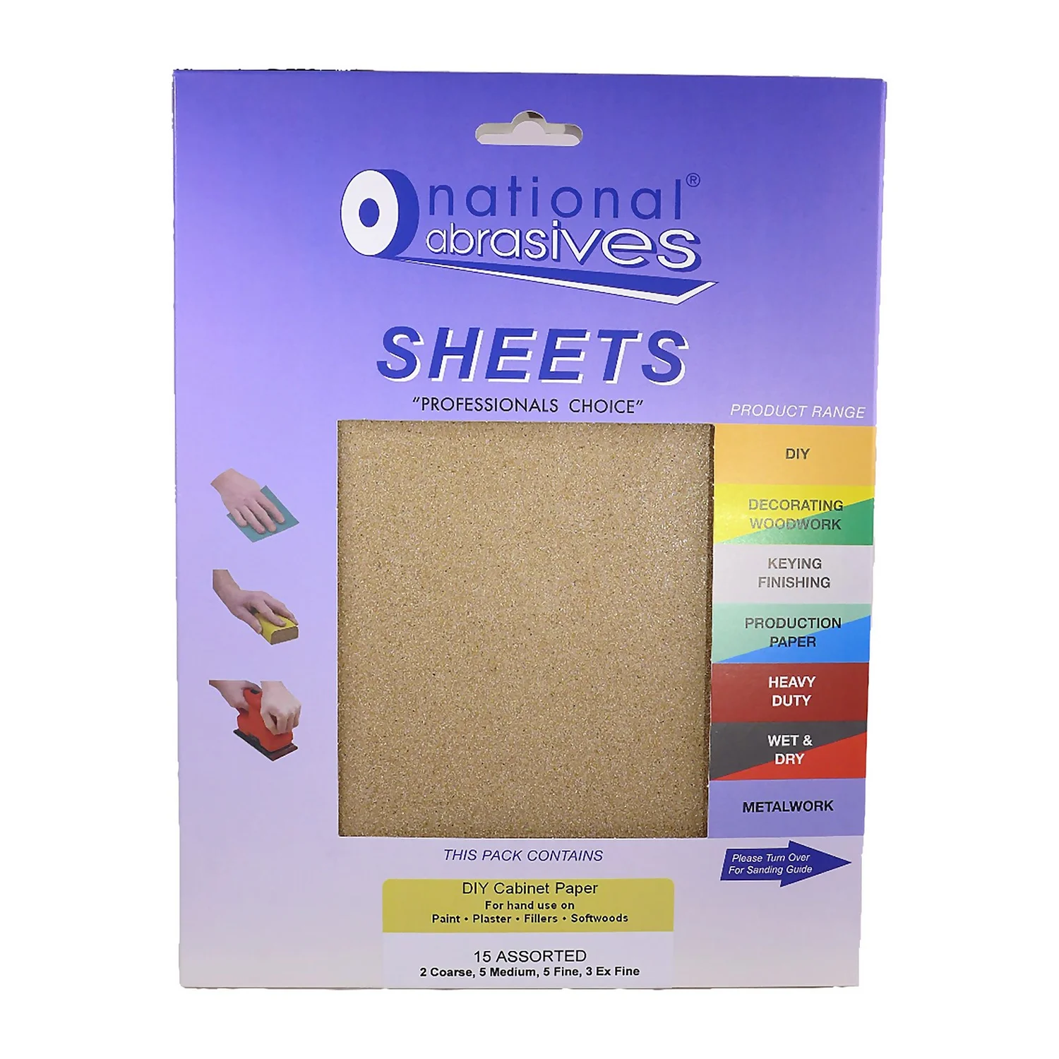 Use this pack of 15 assorted sandpapers to hand sand a variety of surfaces. Use on paintwork, plaster, fillers and softwoods. Made using flint grit, this cabinet sandpaper stays sharper than traditional glass or sand coated papers. The pack contains a selection of coarse, medium, fine and extra fine papers.
