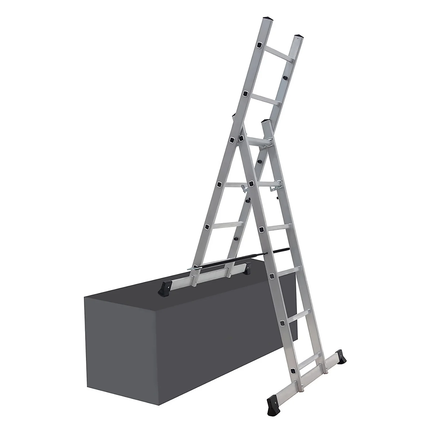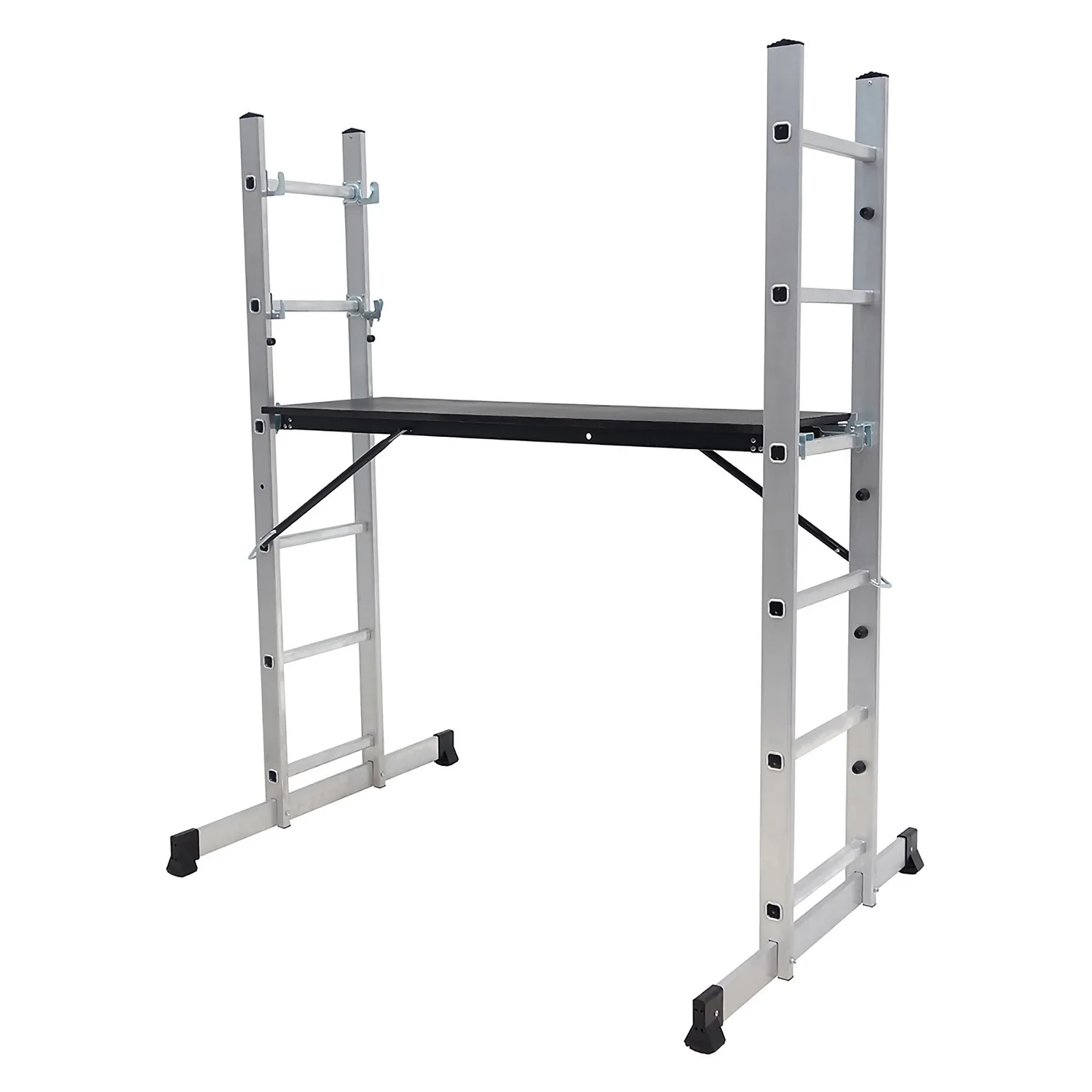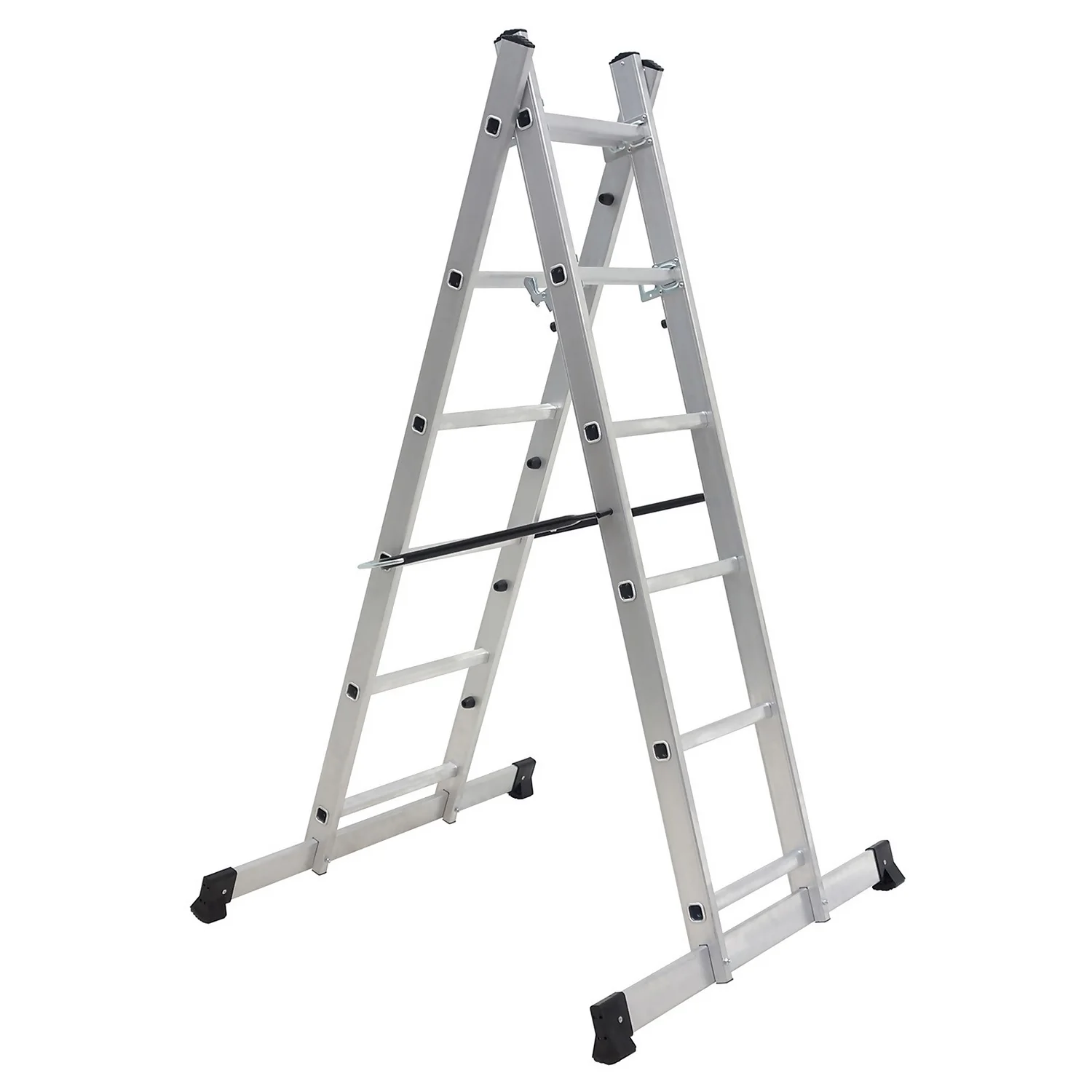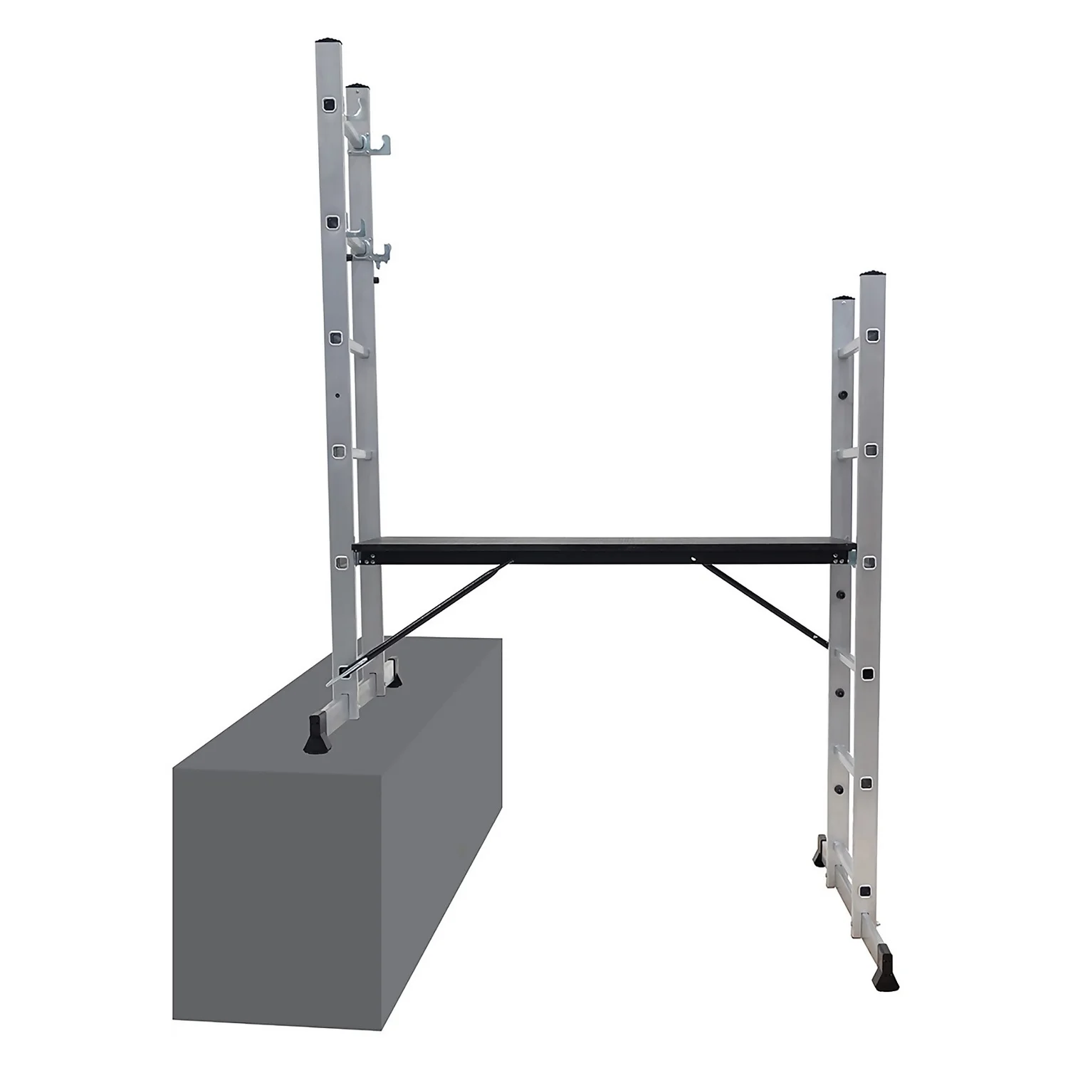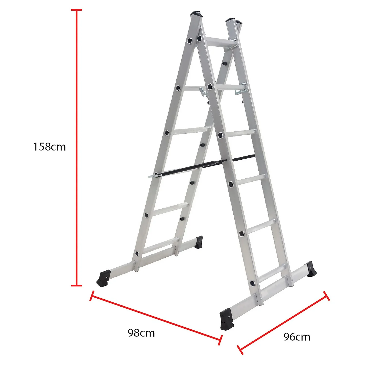 The Rhino 5 in 1 combination ladder is a versatile, multifunctional ladder with 5 different positional modes, a Step Ladder, extension ladder, stairwell ladder, level platform and stairwell platform to cater for different work requirements. Constructed using heavy duty aluminium box section stiles, this ladder is lightweight, reliable and safe. Featuring a locking restraint for added ladder stability when in use, slip-resistant square rungs for comfort and security and a unique sliding mechanism for easy conversion to the 5 different positions.
