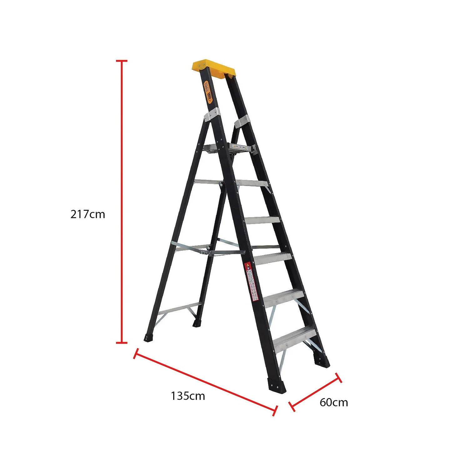 This ladder features H-spreaders to enable single handed operation and add to the strength and stability of the ladder, a multi-functional top cap to keep tools organised and limit trips up and down the ladder and is ideal for working around electricity.