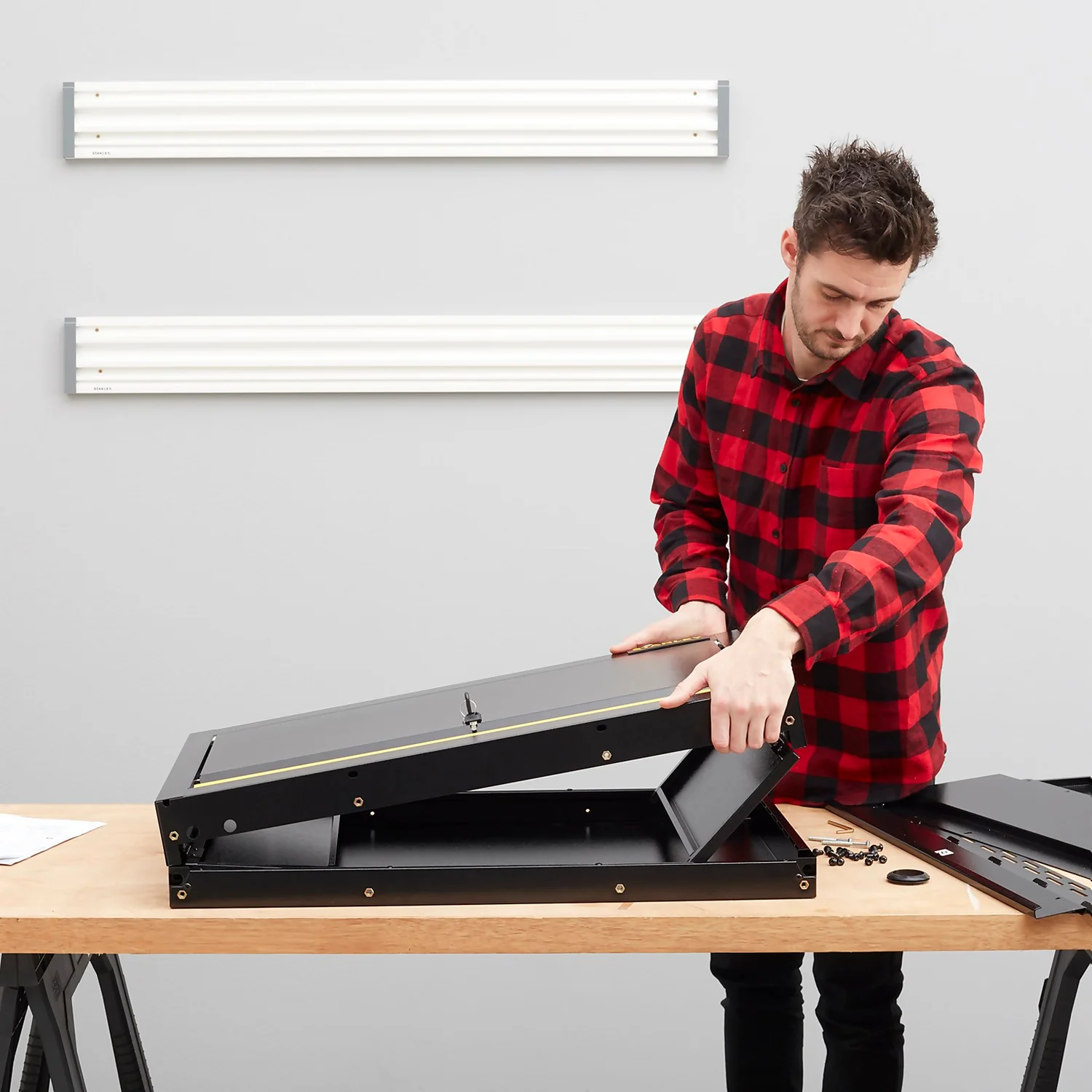 - Can be mounted easily to drywall, studs and masonry, is also compatible with STANLEY Track Wall System Rail