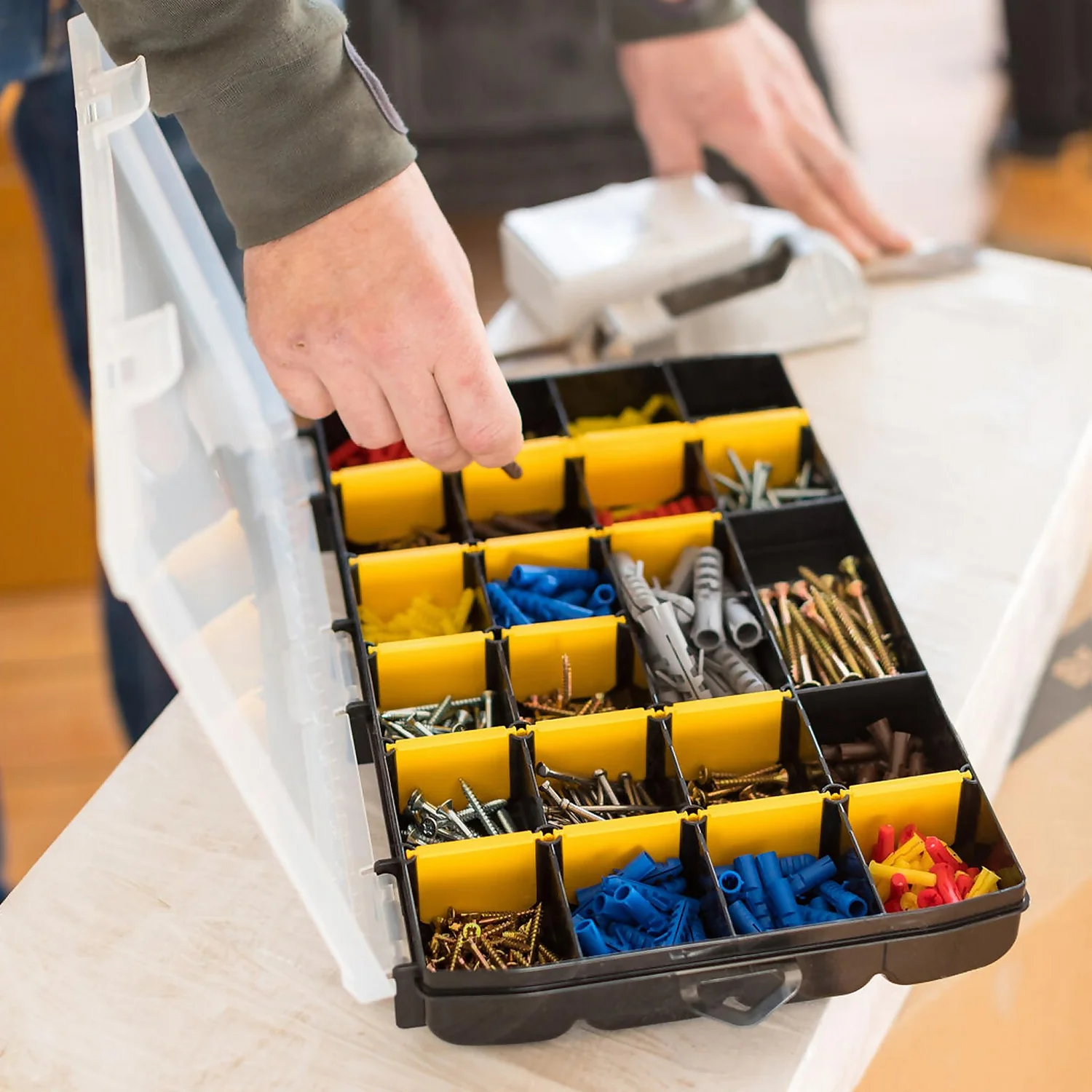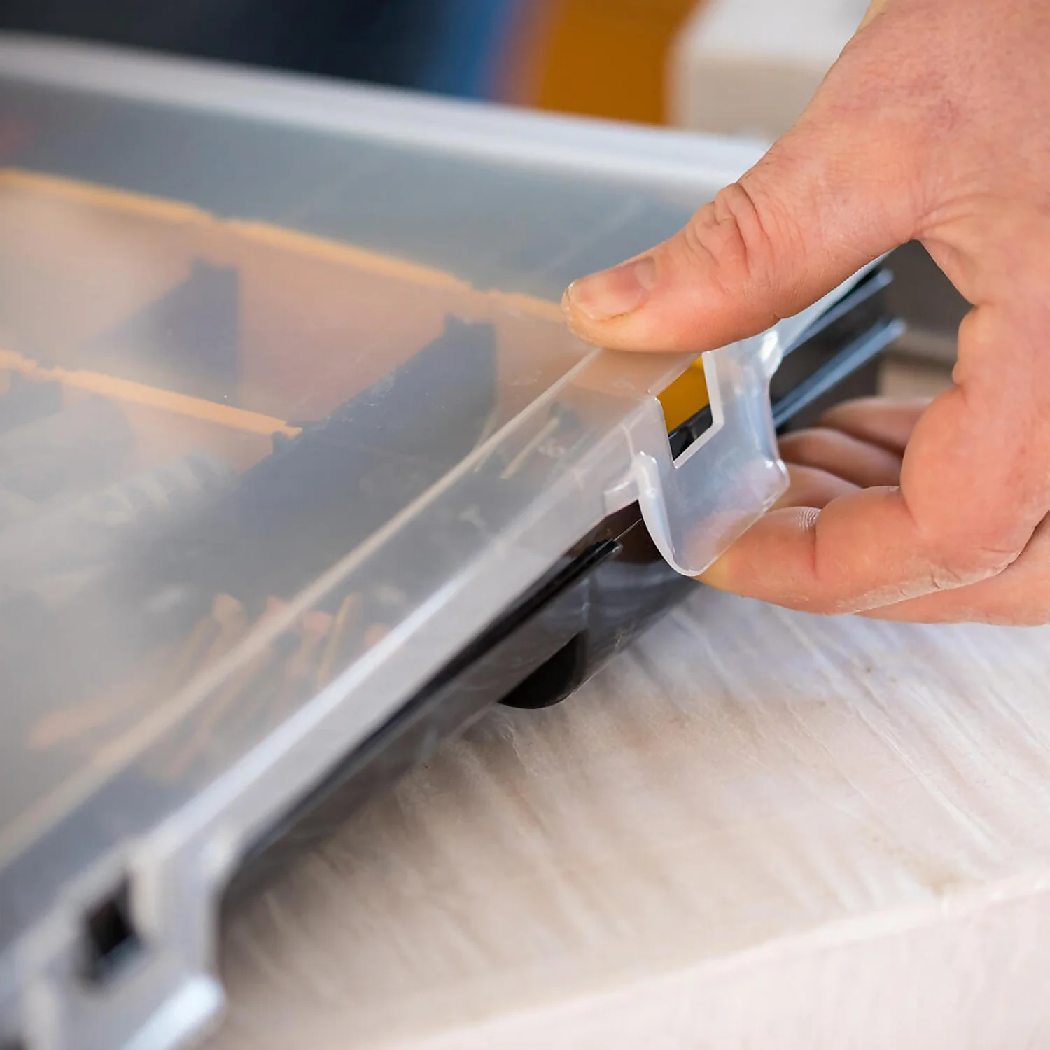 Ideal storage solution for small items around the home and garage including small parts and accessories, any other household items such as sewing kits, arts + crafts materials, screws, wallplug, bolts and nuts.