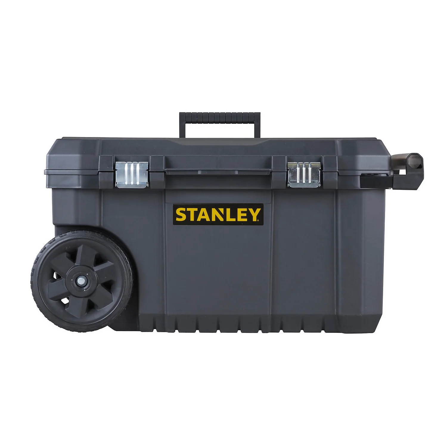The STANLEY Rolling Tool Chest with wheels and telescopic handle is a perfect mobile storage solution, built with sturdy plastic for added durability. The heavy duty metal latches enable smooth opening and closing of the lid. The long telescopic handle and large 7″ wheels make this box easy to manoeuvre during transportation on rougher terrains. The convenient V-groove has been detailed into the lid, which can be used as a platform for cutting timber and pipework.