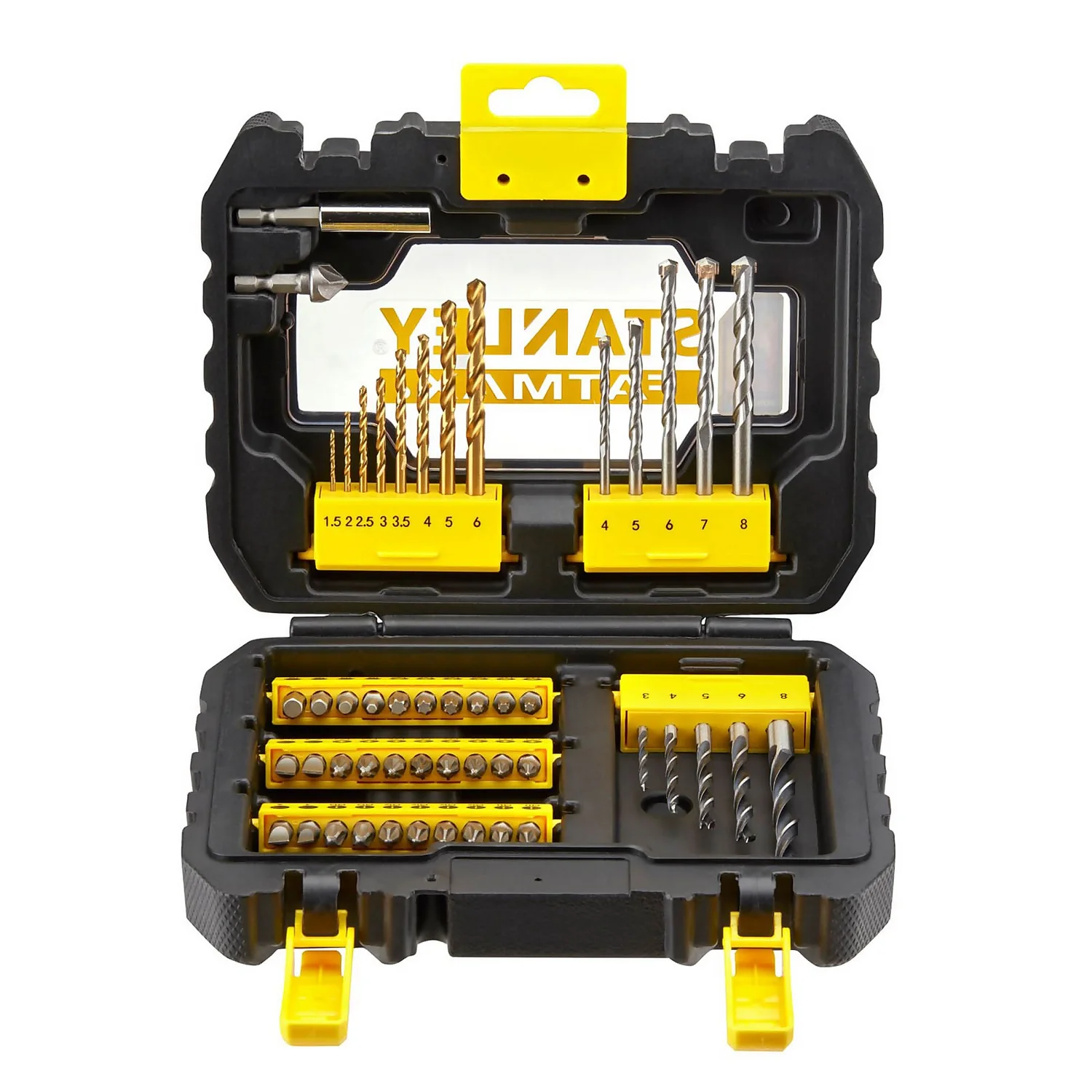 Ideal for being used to drill and drive fixings into multiple materials in a variety of applications including installation of shelves, curtain rails or outside lights and garden decoration. Can be used on concrete, masonry, brick walls, breeze blocks, wood, metal, plastic, ceramic tiles, slate, marble, dry wall. The STANLEY FATMAX 50 Piece Drilling and Driving Set comprises of a comprehensive and versatile set for most drilling and screwdriving applications in wood metal and masonry. The set comes with a convenient moulded case to help keep your accessories safe during transportation. The wide variety of accessory bits is an essential addition to be used with Power tools in any novice to advanced DIY-er’s toolbox. Comes with 5x Wood 3,4,5,6,8mm, 5x masonry 4,5,6,7,8mm, 8x titanium metal 1.5,2,2.5,3,3.5,4,5,6mm, Screwdriver bits: Ph1 x2, Ph2 x4, Ph3 x2. Pz1 x2, Pz2 x4, Pz3 x2. SL4, SL6, SL7.2 x2, T15 x2, T20, T25 x2, T30. HX3, HX4, HX5, HX6, Magnetic bit holder and countersink.