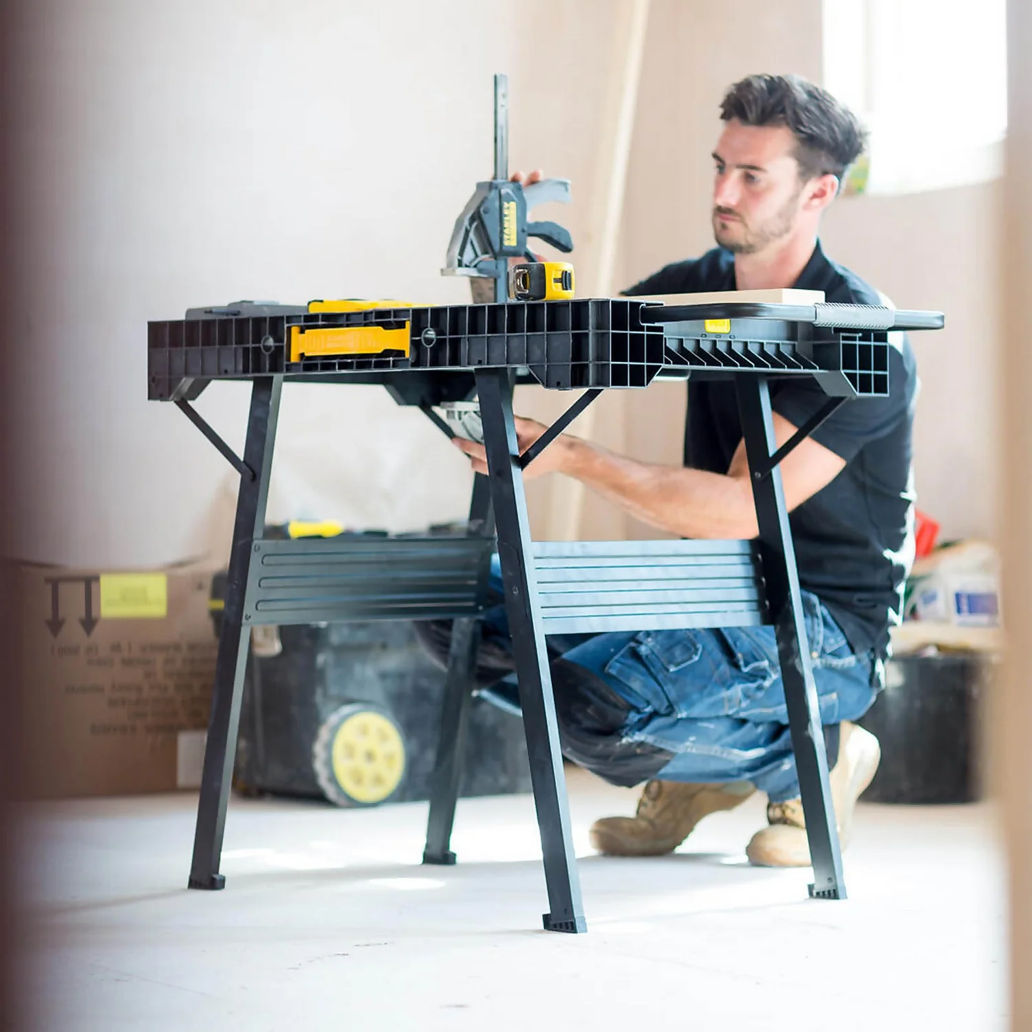 The STANLEY workbench has been designed for DIY-ers and their limitless projects in mind, allowing you to fix the piece you are working on to the workbench. Comes with folding workbench.
