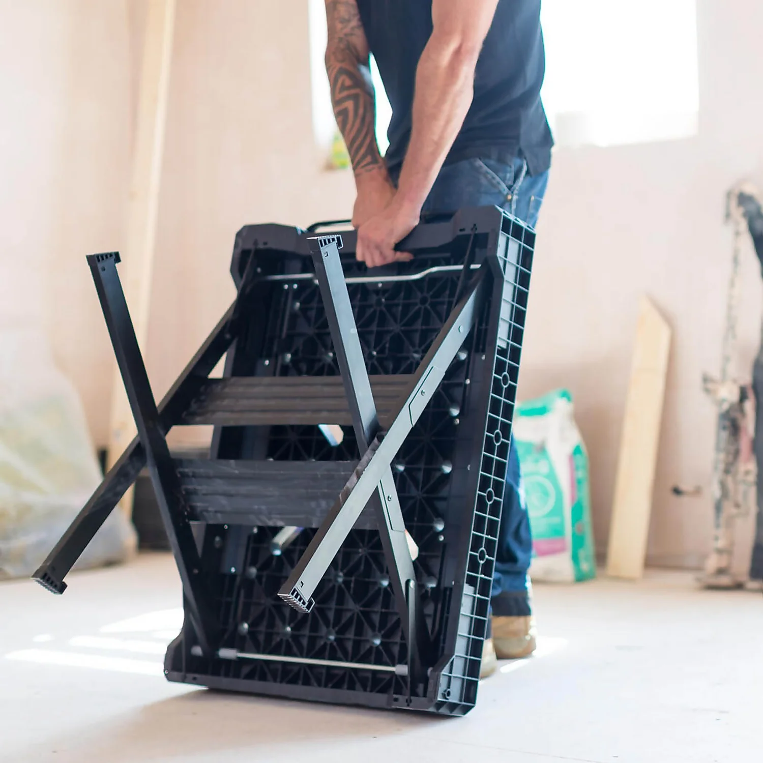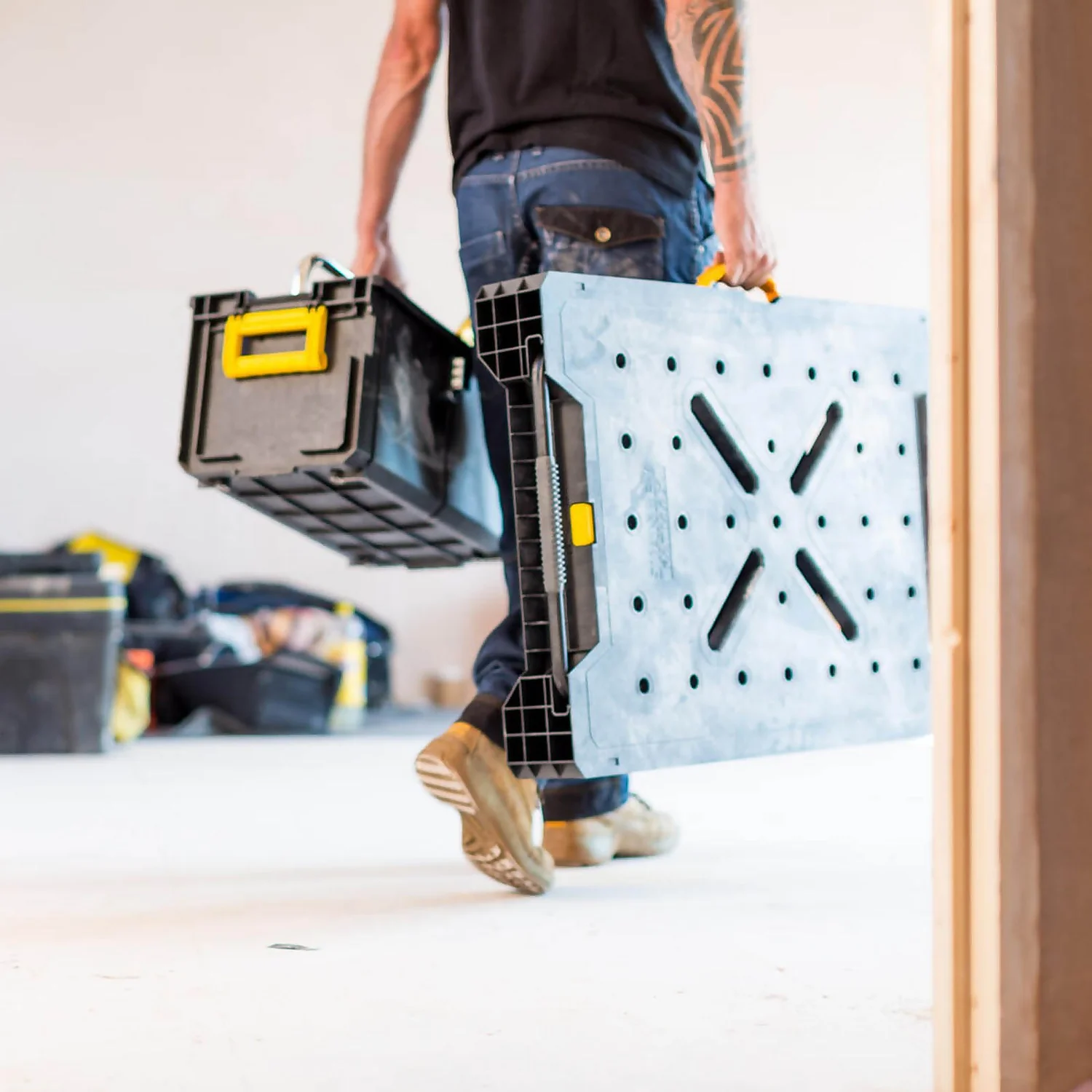 Thanks to its quick collapsing, durable metal legs, the folding workbench can be easily set up in seconds and is exceptionally solid and stable, supporting heavy loads of up to 450kg. At the end of a project, simply fold the workbench effortlessly into a compact unit for easy storage or carry with the integral carry-handles for hassle-free transportation.