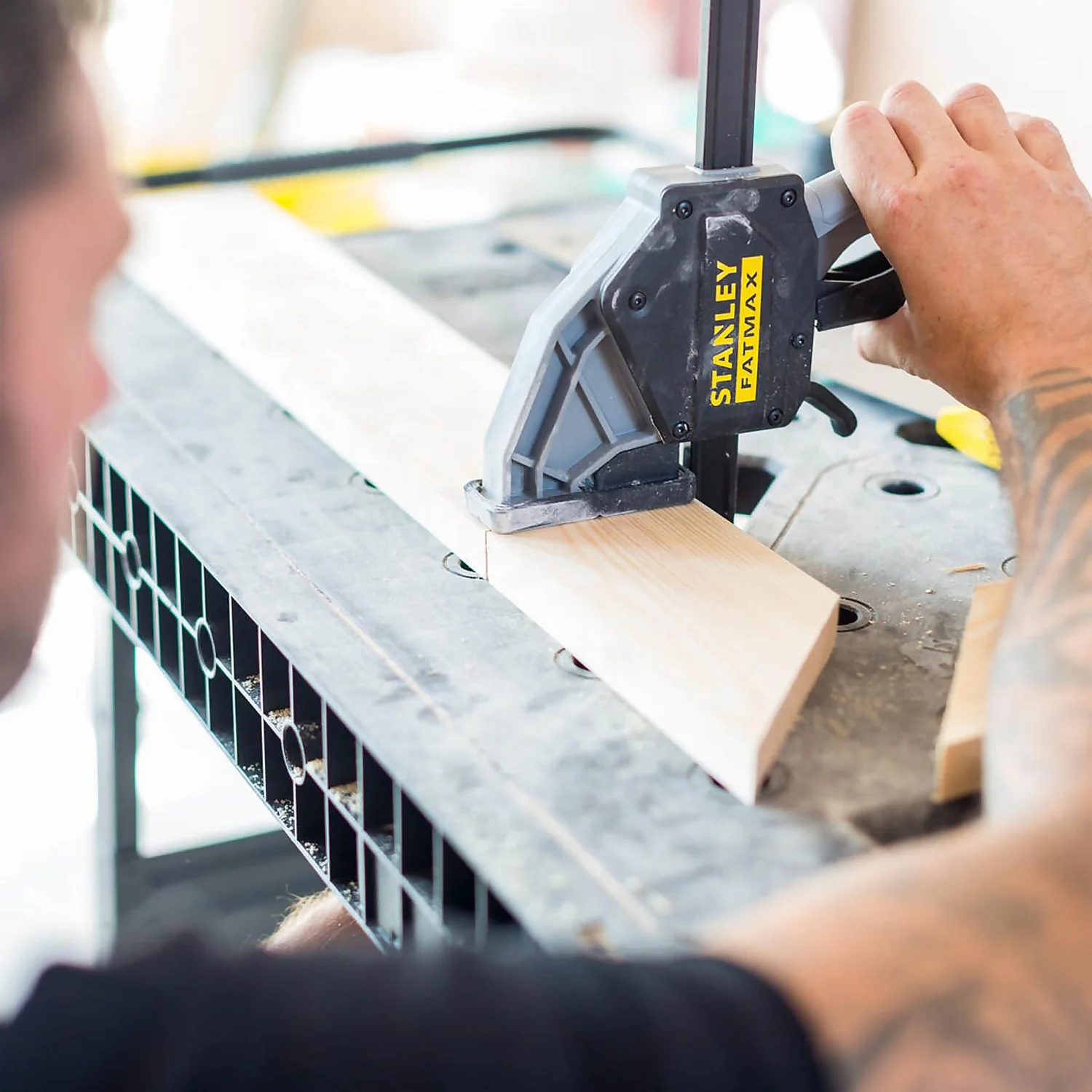 The STANLEY FATMAX EXPRESS Folding Workbench is perfect for anyone who requires a robust, portable working surface with substantial material holding capacity. Ergonomically-engineered, it has been designed with a spacious working platform, suitable for a host of holding applications with items that have large surface areas. Compatible with an extensive range of vertical and horizontal clamps, the Workbench features a series of ‘dog bench’ holes and x-shaped grooves, for hassle-free clamping of items at any angle.