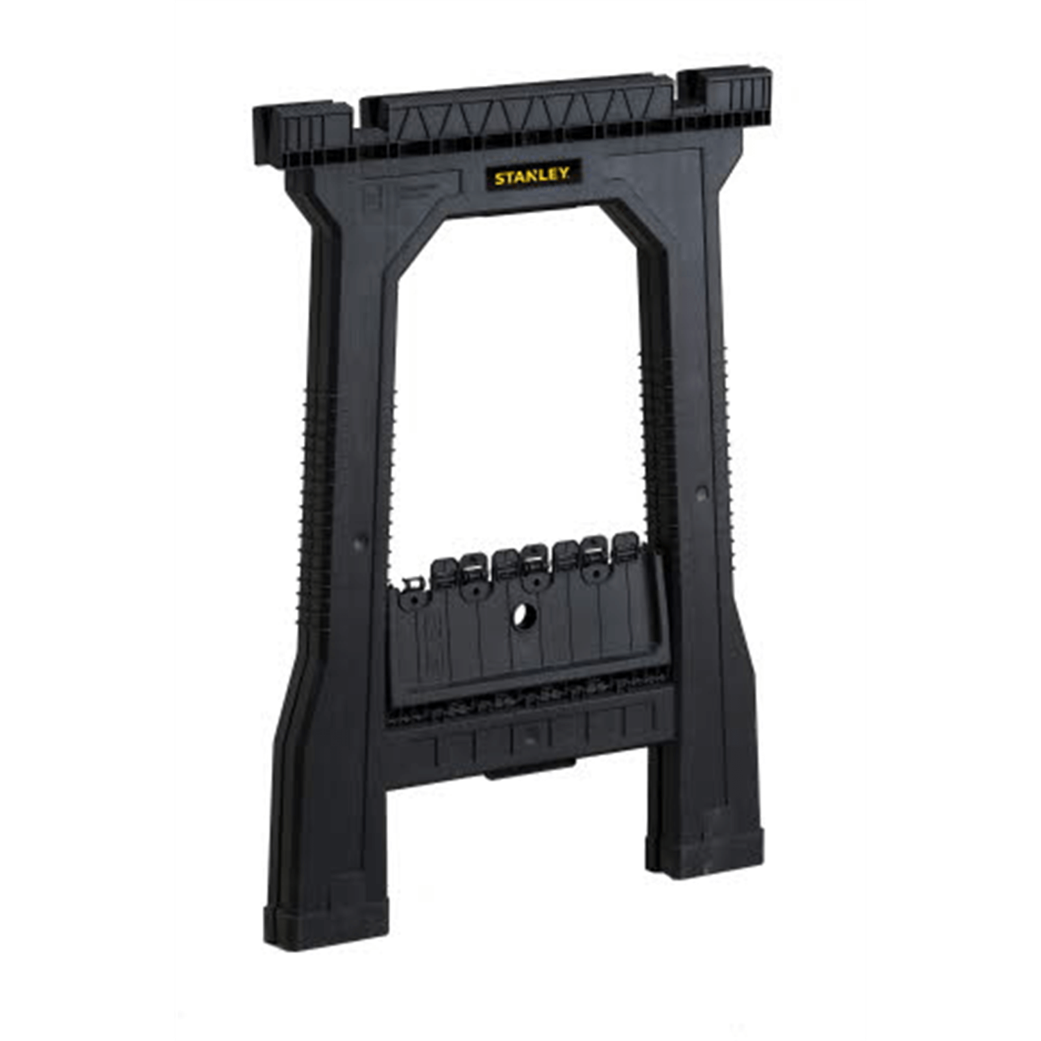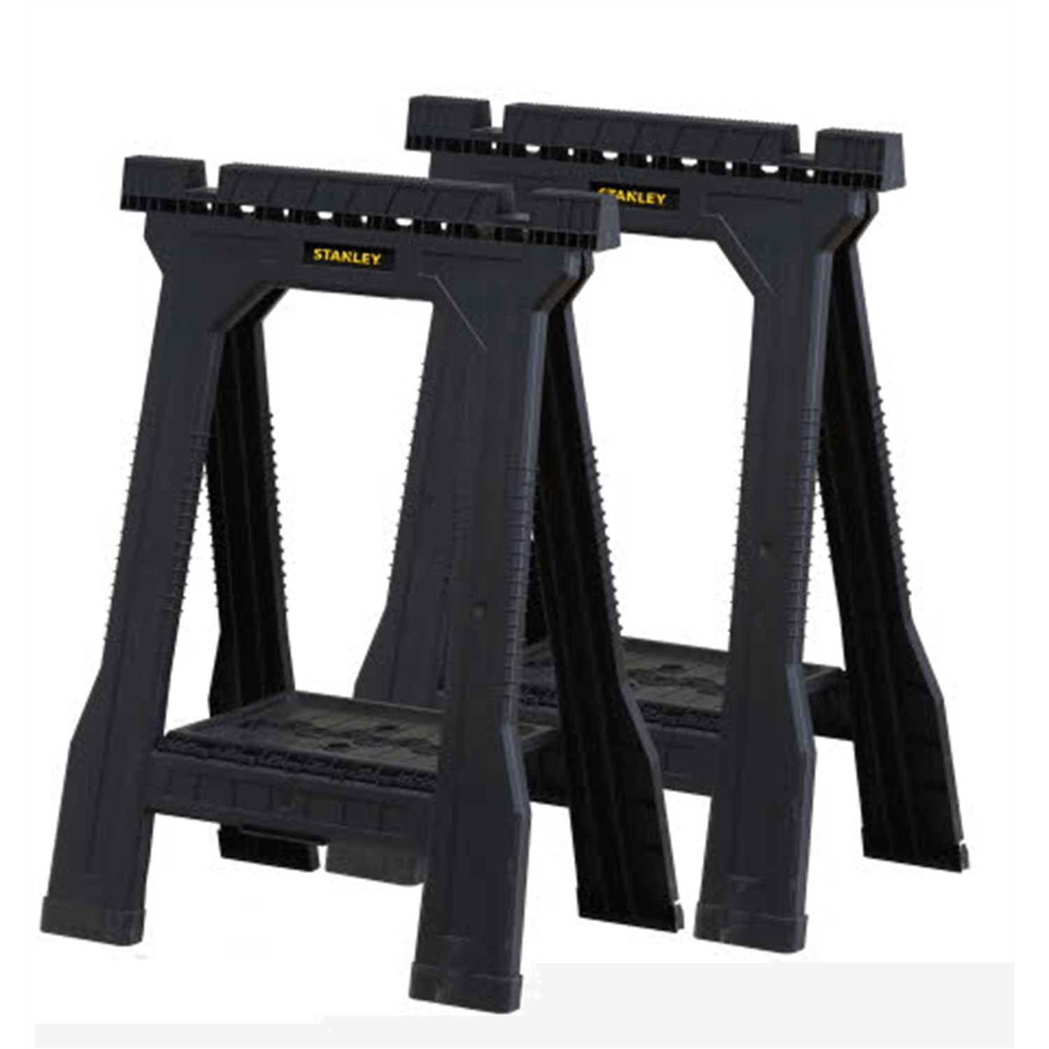 The Stanley Junior Saw Horse is a twin-pack folding saw horse, each horse supporting 362kg maximum load and folds flat for easy carrying and storage.