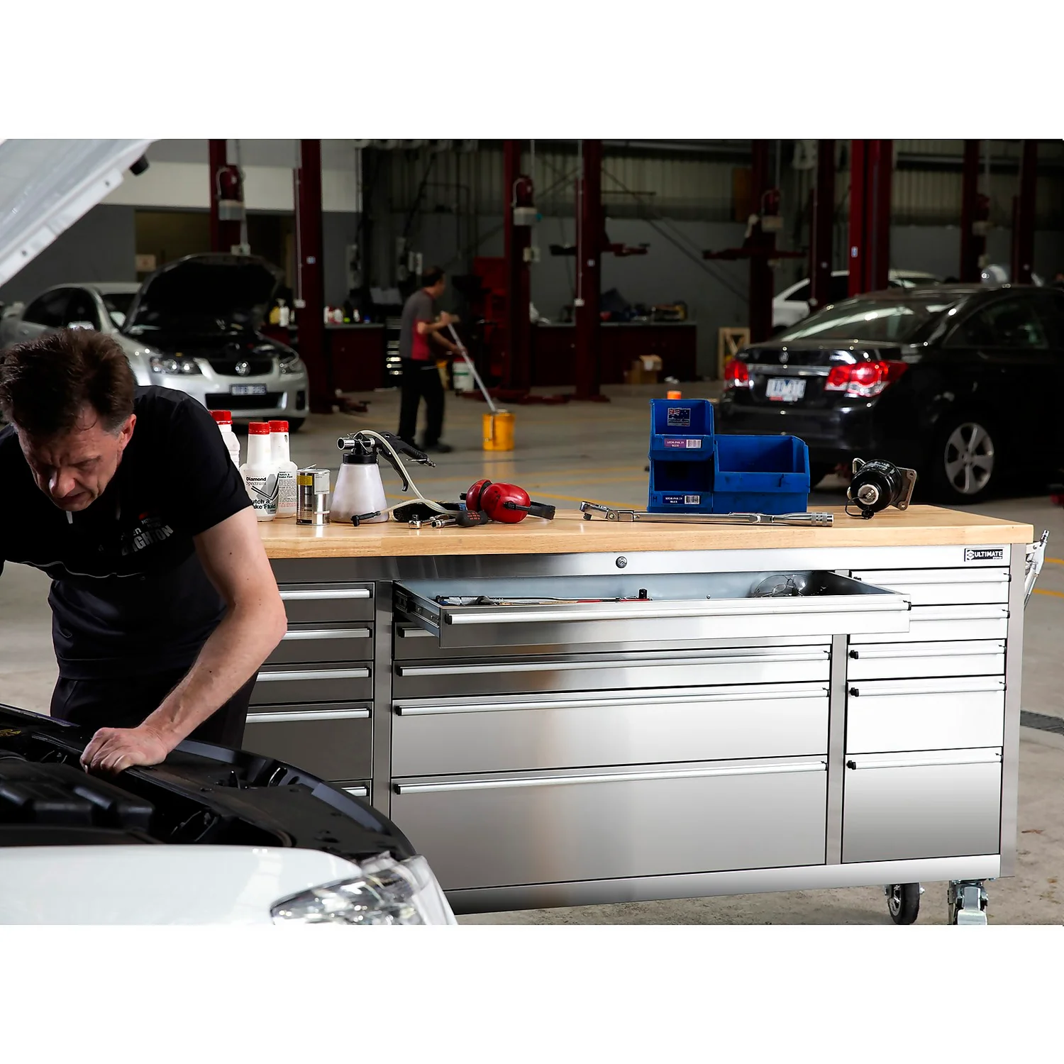 A stylish alternative in tool storage, this tool trolley is modern and versatile, made from 430 grade anti-fingerprint stainless steel and solid hardwood. Stainless steel push handles and fully lined drawers provide a quality finish to complete the look.