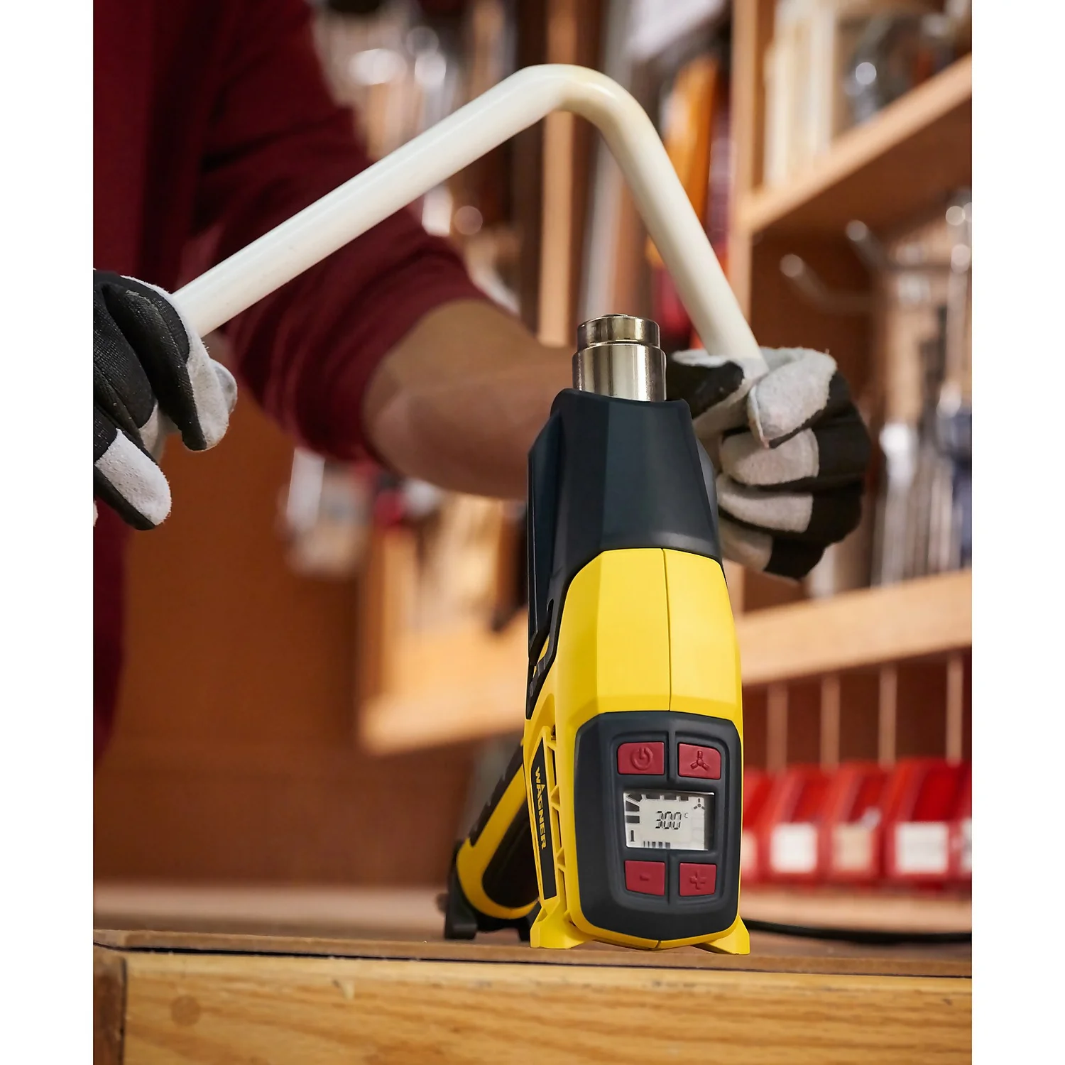 Professional electronic heat gun for stripping paint, bending pipes, heat shrinking and much more. Features LCD digital display with fully adjustable temperature range. Offers memory function for last temperature recall. 6-air flow settings and a cool-down mode help to prolong heater element’s life.