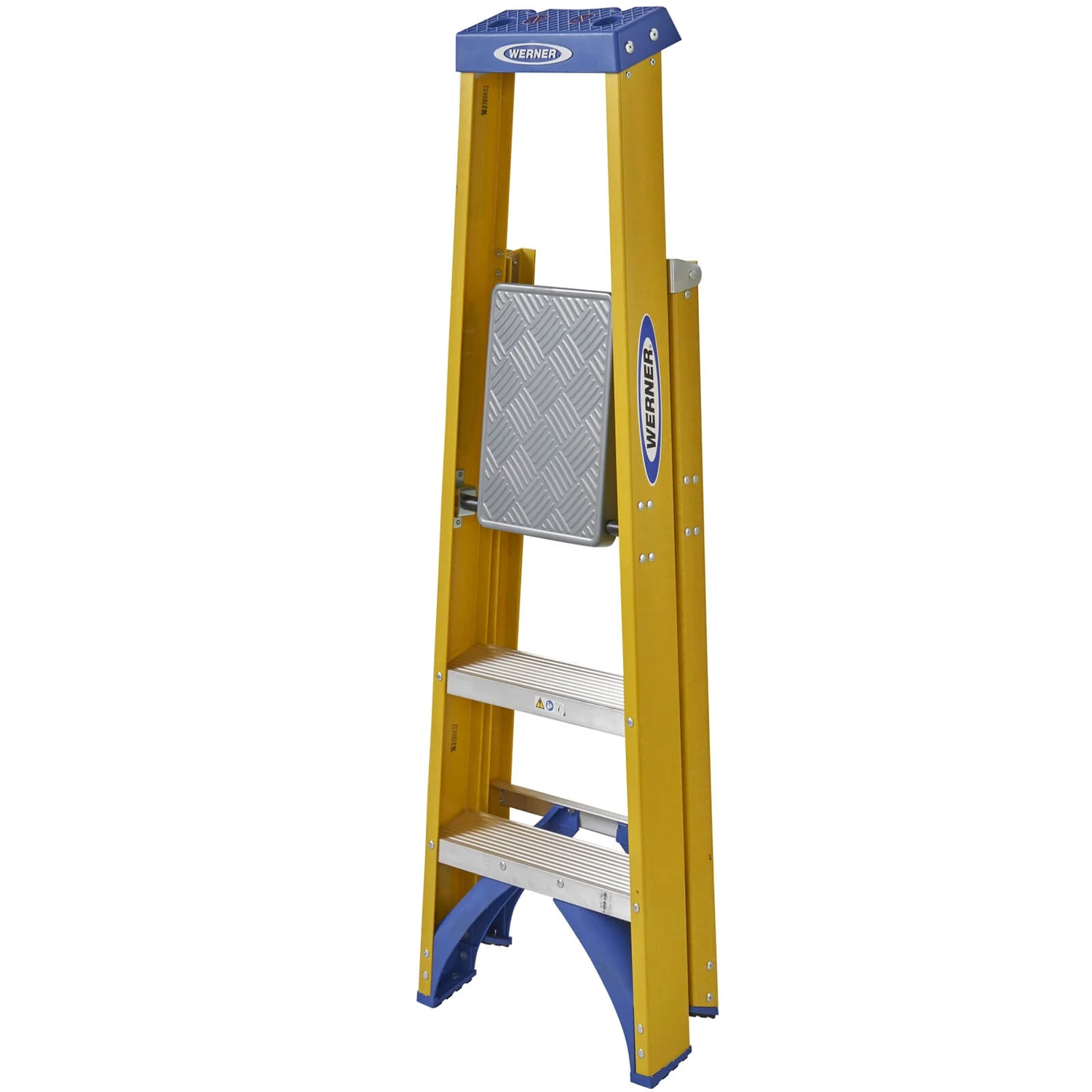 The Werner 3 tread platform Step Ladder is constructed using extremely durable, non conductive, seven-layer fibreglass rails that are highly resistant to weathering. A platform height of 0.70m enables a safe working height of 2.45m* so this ladder is ideal for any job around the worksite. This ladder features a multi-functional HolsterTop to keep tools organised and limit trips up and down the ladder and is ideal for working around electricity. Other features include slip-resistant steps for comfortable standing and EDGE bracing to help prevent rail damage. Approved to the latest EN131 standard. For Professional Use.